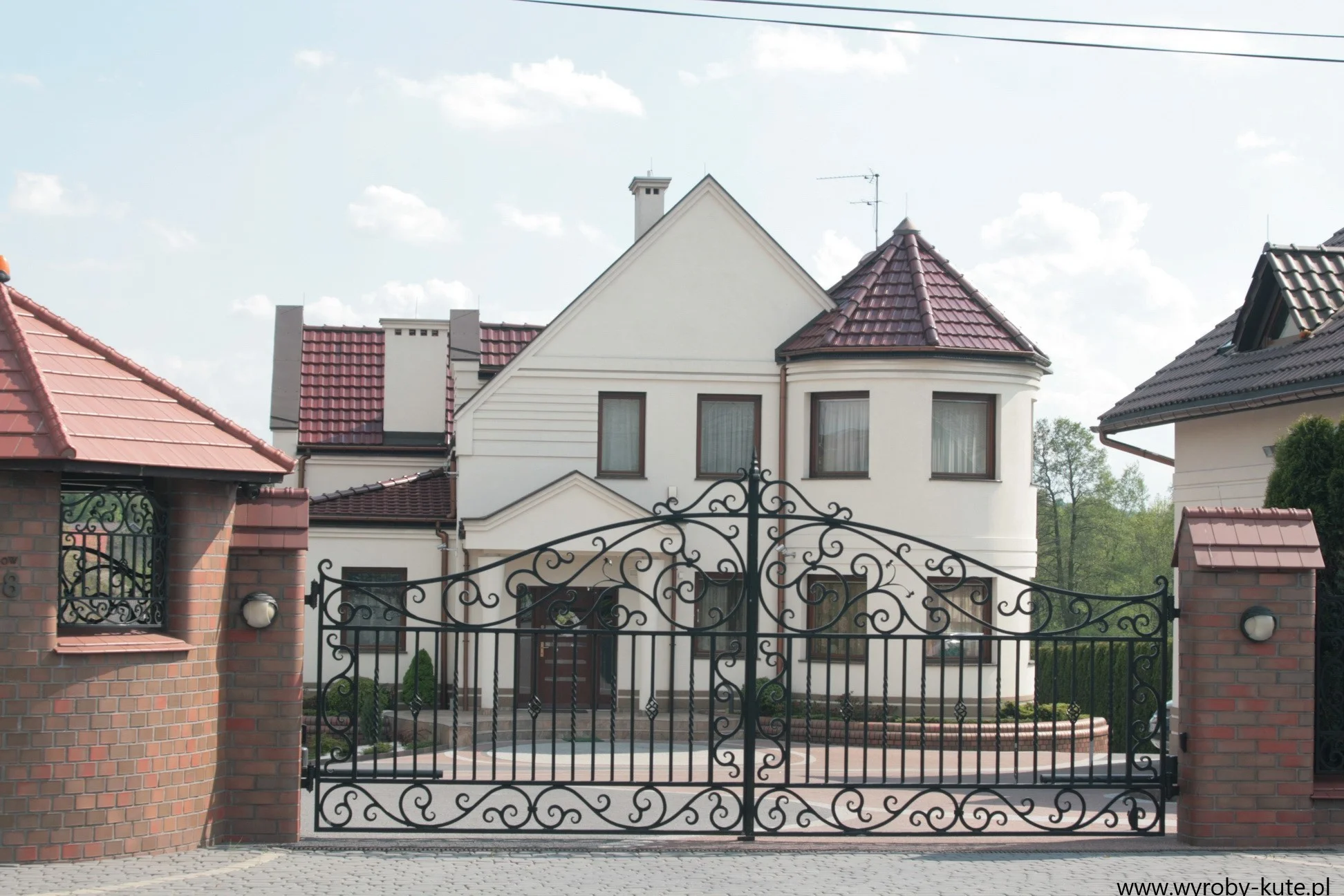Imponująca brama wjazdowa o niezwykle bogatym rysunku. Zamiast prostych prętów zastosowano tu skomplikowany układ wolut i łuków, tworzący dynamiczną, niemalże płynną kompozycję. Idealnie komponuje się z klasyczną architekturą willi.