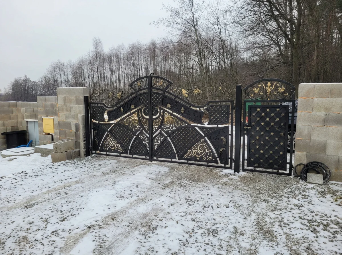 Realizacja ta jest świadectwem najwyższej próby kunsztu kowalskiego, gdzie tradycyjne techniki obróbki metalu spotykają się z nowoczesną precyzją. Największym wyzwaniem podczas prac było uzyskanie idealnej symetrii przy tak ogromnym zagęszczeniu detali. Każda woluta, liść akantu oraz element floralny zostały ręcznie wykuwane przez naszych mistrzów, co nadaje im organiczny, unikalny charakter, niemożliwy do osiągnięcia w produkcji masowej. Szczególną uwagę zwraca skomplikowany wzór kratownicy (caro), który wymagał milimetrowej dokładności przy spawaniu i szlifowaniu połączeń, aby konstrukcja zachowała swoją sztywność przy jednoczesnym zachowaniu wizualnej lekkości. Całość została poddana procesowi cynkowania ogniowego oraz malowania proszkowego, co zapewnia wielopokoleniową odporność na czynniki atmosferyczne. Finałowym akcentem jest ręczne patynowanie, które wydobywa głębię detali i nadaje bramie szlachetny, antyczny wygląd, podkreślając jej artystyczną wartość.