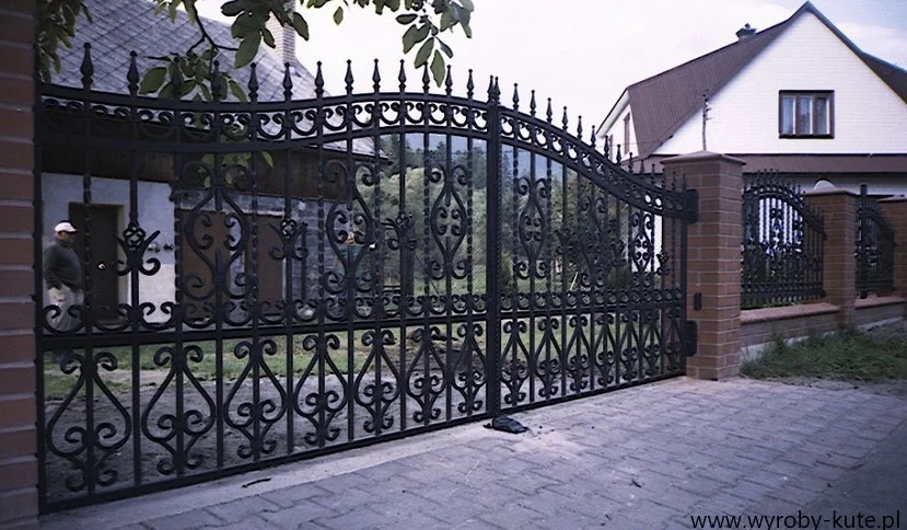 Tradycyjna brama wjazdowa osadzona w słupkach z klinkieru. Wzór oparty na pionowych prętach, urozmaicony pasem elementów w kształcie serca w dolnej części skrzydeł.