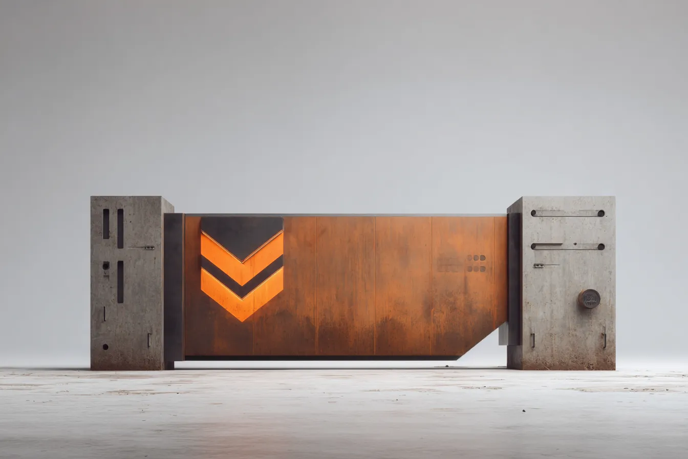 W tym modelu kluczowa jest integracja światła z materią. Szewrony nie są płaskie – to wystające lub wgłębione elementy z półprzezroczystego tworzywa, które w dzień są czarne, a w nocy świecą. Betonowe słupy są odlewane z użyciem matryc, które nadają im techniczny relief. Mechanizm bramy jest całkowicie ukryty w pylonie, co podkreśla monolityczność konstrukcji. Corten jest tu traktowany jako kamuflaż – naturalna, ziemista barwa kontrastuje z technologicznym blaskiem diod.