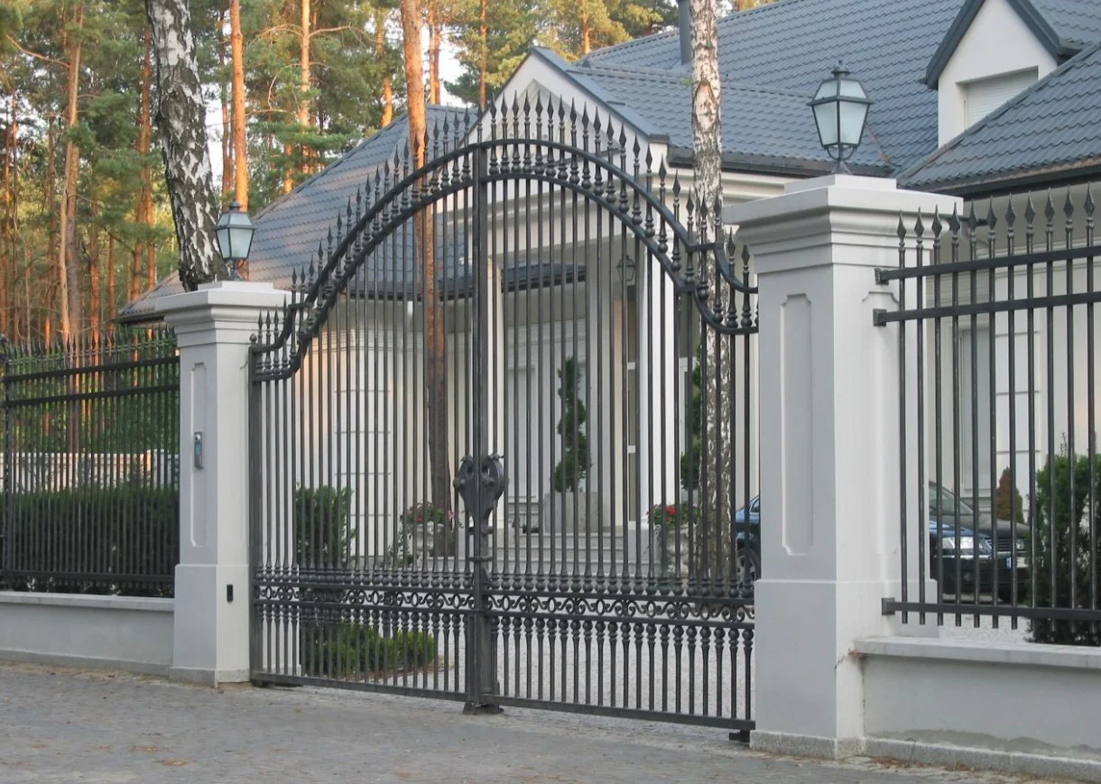 Imponująca brama wjazdowa o klasycznej formie łuku. Pionowe pręty zakończone ozdobnymi grotami, solidne słupy.