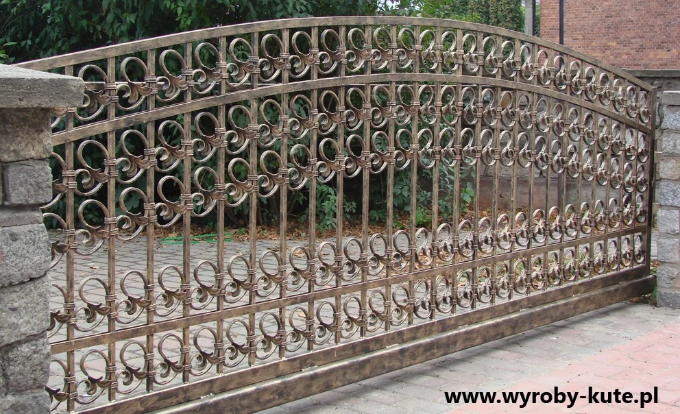 Solidna brama wjazdowa o zwartej konstrukcji. Wypełnienie stanowią pionowe pręty oraz liczne esownice (szczególnie w górnej partii), co zapewnia prywatność i bezpieczeństwo. Górna krawędź wykończona łukiem.