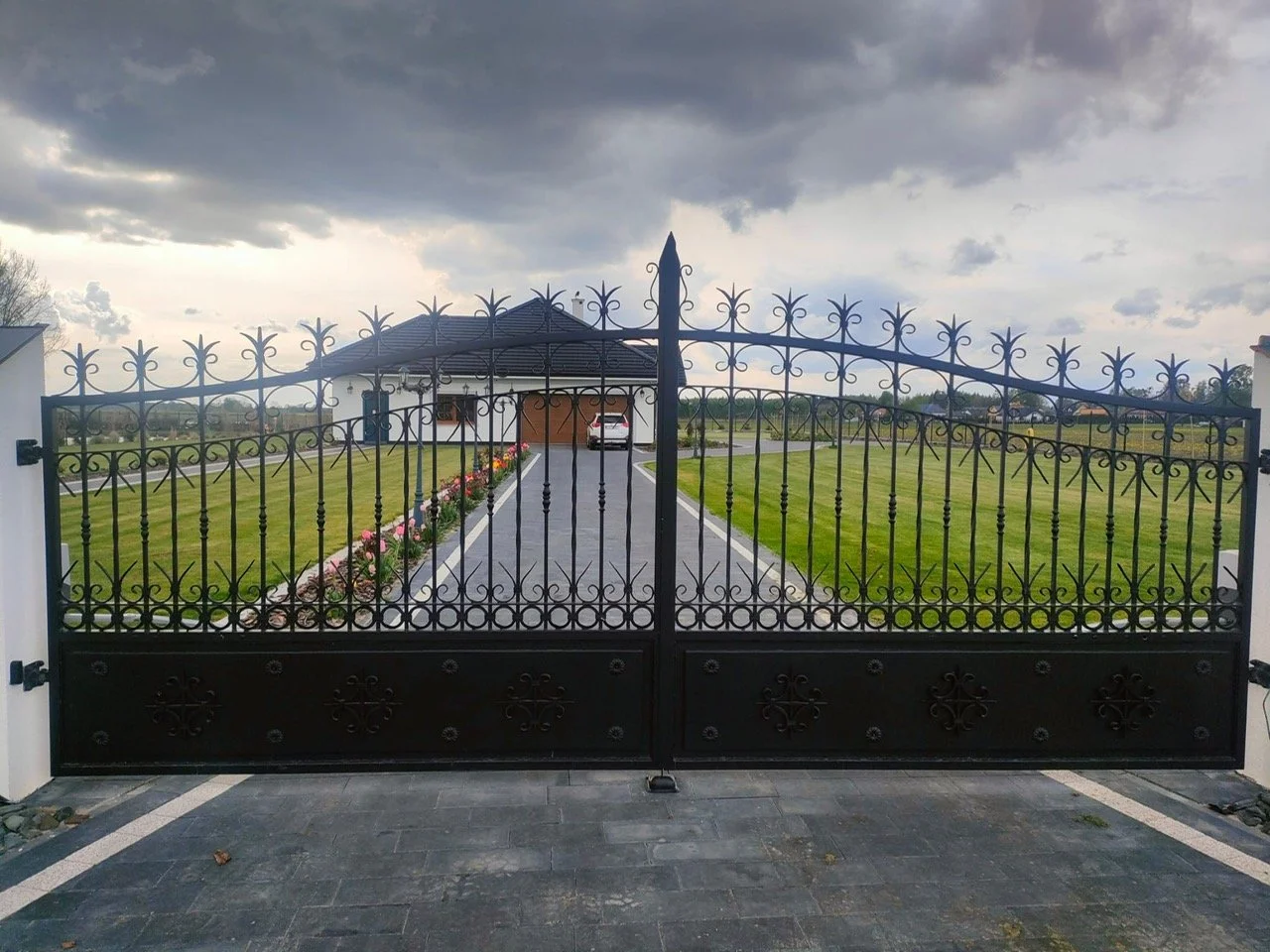 Widok na bramę wjazdową w kontekście całej posesji, podkreślający jak dobrze klasyczne kowalstwo współgra z nowoczesną bryłą domu.