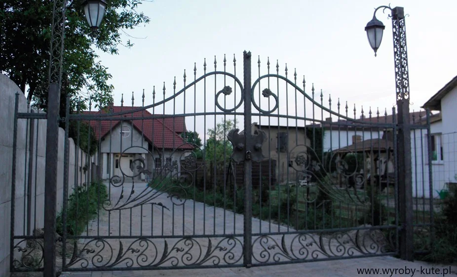 Unikalna konstrukcja, w której słupy bramowe zostały przedłużone i zakończone ozdobnymi latarniami, tworząc zintegrowane oświetlenie wjazdu. Sama brama jest lekka, z dekoracyjnym motywem roślinnym u dołu.