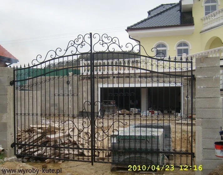 Realizacja dopasowana do specyficznego ukształtowania terenu (wjazd do garażu na poziomie niższym lub w skarpie). Brama jest wysoka, z ozdobnym zwieńczeniem w formie korony z esownic.