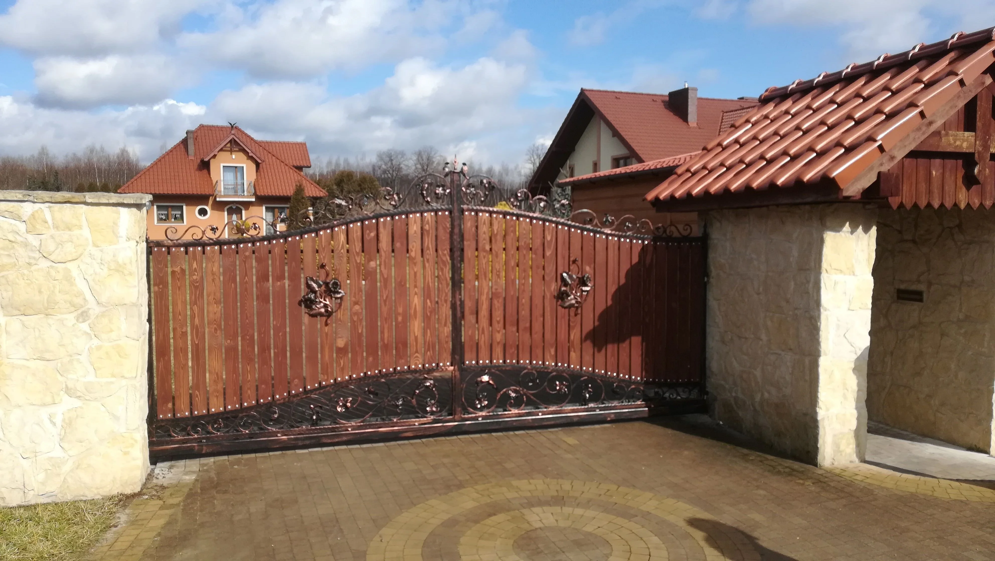 Prezentowana realizacja to prawdziwe arcydzieło współczesnego kowalstwa artystycznego, które wykracza poza ramy zwykłego ogrodzenia, stając się manifestem prestiżu i wyrafinowanego gustu właściciela. Brama 'Arystokratyczna Harmonia' stanowi unikalną fuzję surowej, kutej stali oraz ciepłego, naturalnego drewna, tworząc barierę, która nie tylko chroni prywatność, ale przede wszystkim zachwyca swoją estetyką. Majestatyczne łuki konstrukcji idealnie korespondują z linią horyzontu, a bogato zdobione zwieńczenia dodają całej posesji pałacowego charakteru. Każdy detal został zaprojektowany tak, aby budować atmosferę bezpieczeństwa i niedostępnego luksusu, jednocześnie wpisując się w otaczającą architekturę rezydencjonalną. Gra świateł na patynowanych elementach metalowych podkreśla trójwymiarowość projektu, sprawiając, że brama o każdej porze dnia prezentuje się zgoła inaczej, zawsze jednakowo imponująco. Jest to inwestycja w wizerunek nieruchomości, która podnosi jej wartość i nadaje jej niepowtarzalny, elitarny rys. Firma IDEOVO specjalizuje się w kompleksowej obsłudze: od indywidualnego projektu, przez precyzyjne wykonanie, aż po profesjonalny montaż.