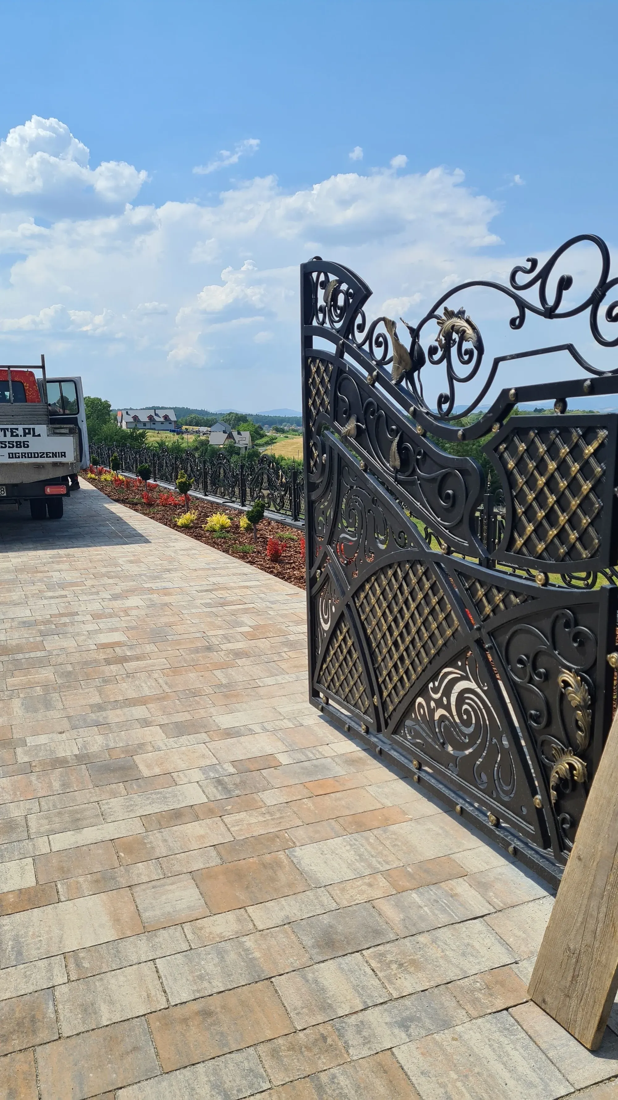 Majstersztyk kowalstwa artystycznego - brama z bogatymi motywami roślinnymi, rzeźbionymi liśćmi i misterną kratką, podkreślona złotą patyną.