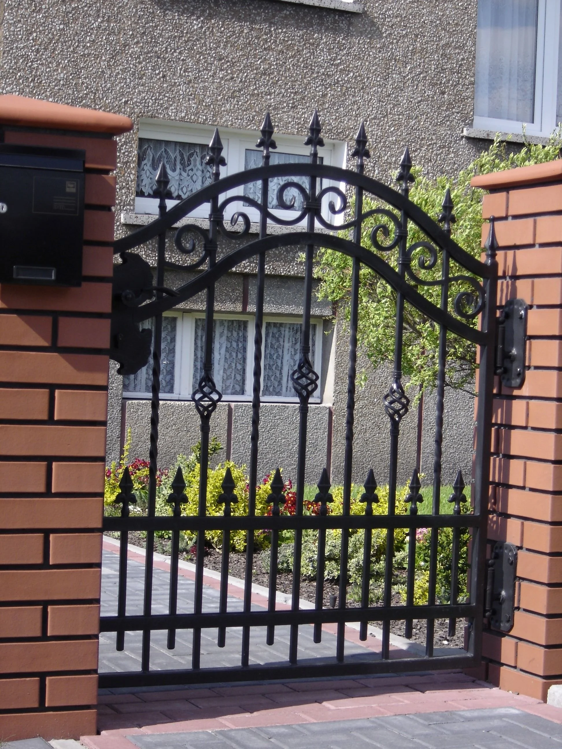 Klasyczna furtka wejściowa zdobiona esownicami i grotami. Solidne wykonanie spójne z linią ogrodzenia posesji.