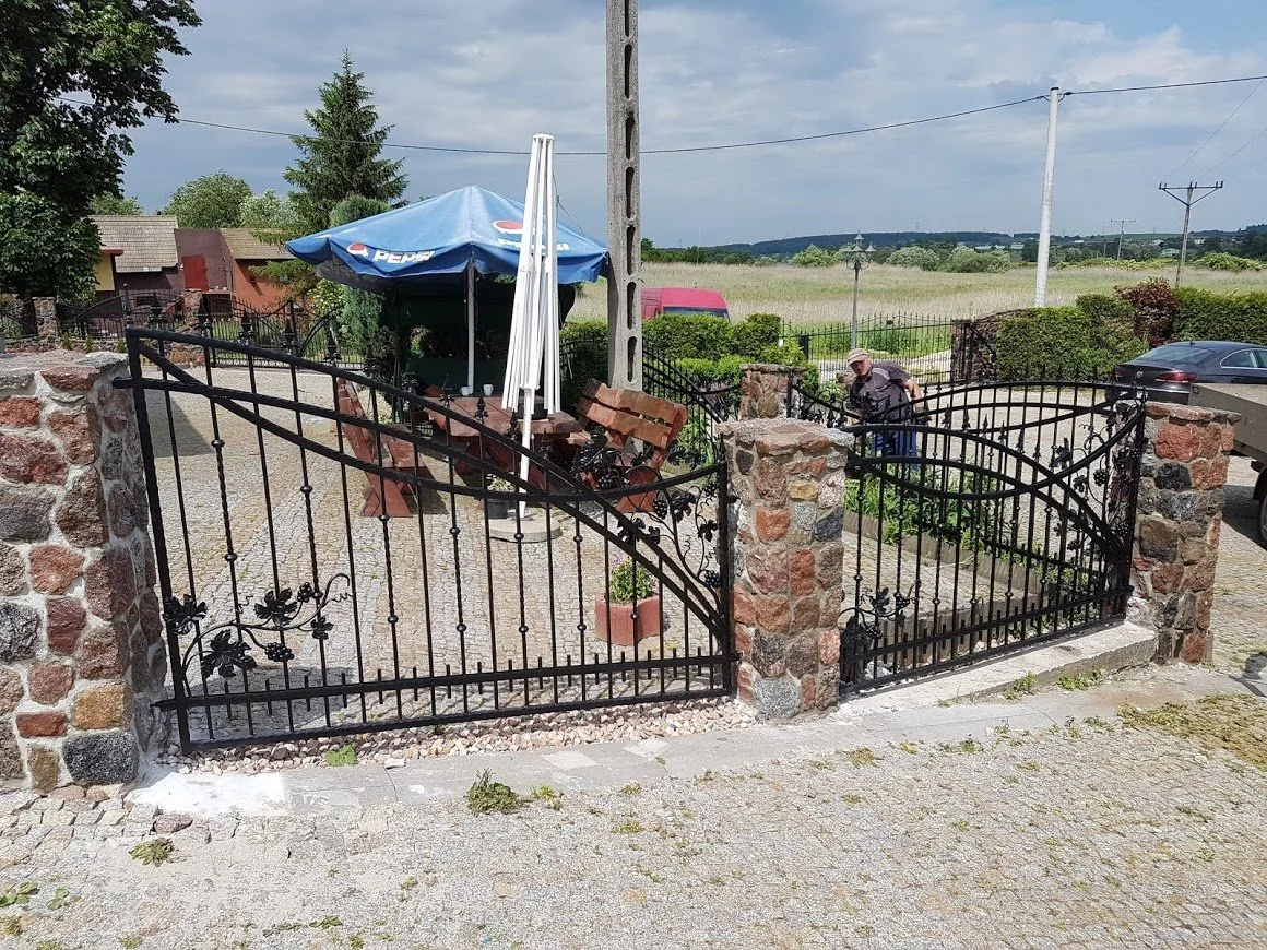 Furtka będąca integralną częścią systemu ogrodzeniowego z motywem fal i winorośli, idealnie dopasowana do bramy głównej.