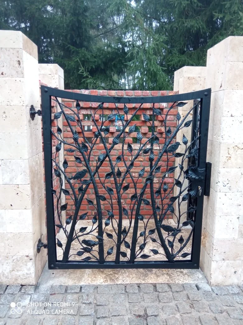 Artystyczna furtka z motywem leśnym. Kute gałęzie i figurki ptaków tworzą niepowtarzalny, organiczny wzór.