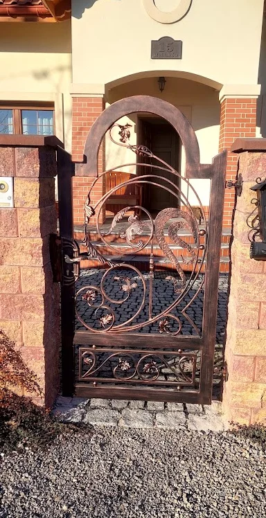 Stylowa furtka wejściowa z unikalnym motywem roślinnym, wykończona miedzianą patyną. Wyraźny element identyfikacji wizualnej posesji.