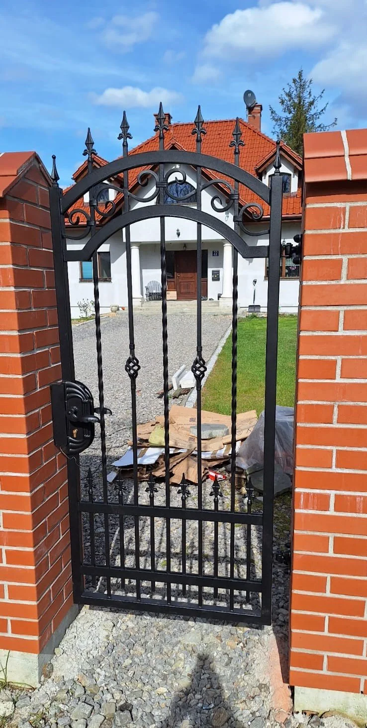 Realizacja furtki wejściowej, która idealnie komponuje się z tradycyjną architekturą i ogrodzeniem z cegły.