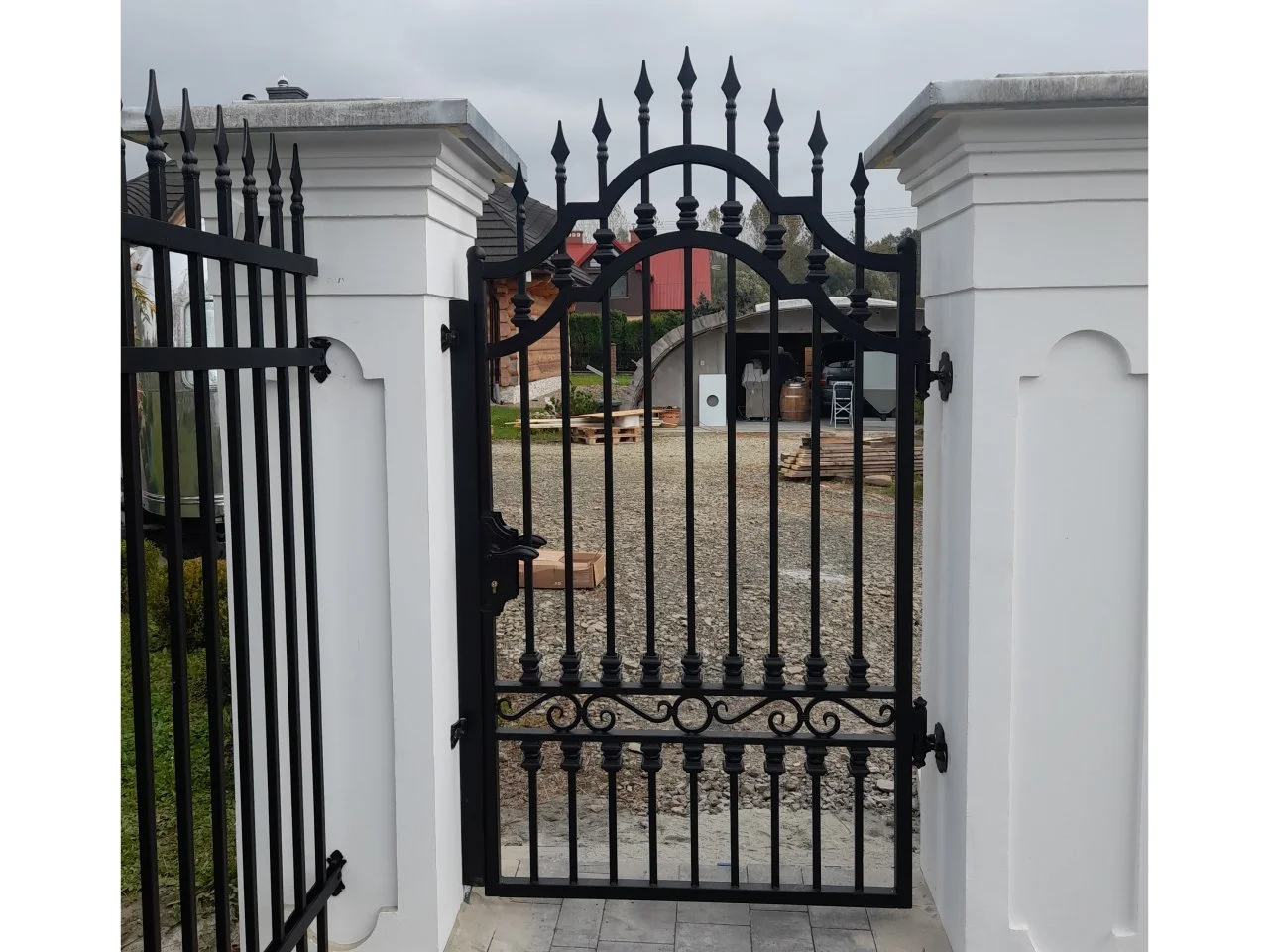 Furtka o prostym, rymicznym układzie tralek z ozdobnymi elementami u góry. Idealnie komponuje się z białymi słupami ogrodzeniowymi.