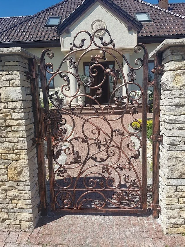 Furtka z miedzianą patyną, stanowiąca wejście do eleganckiej posesji. Trwałość i unikalny styl wyrobów kuty ch.
