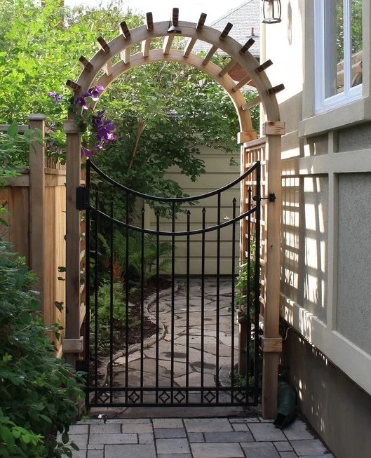 Malownicza furtka ogrodowa z łukiem, wkomponowana w drewnianą pergolę. Prosty, elegancki wzór idealny do zielonych zakątków.
