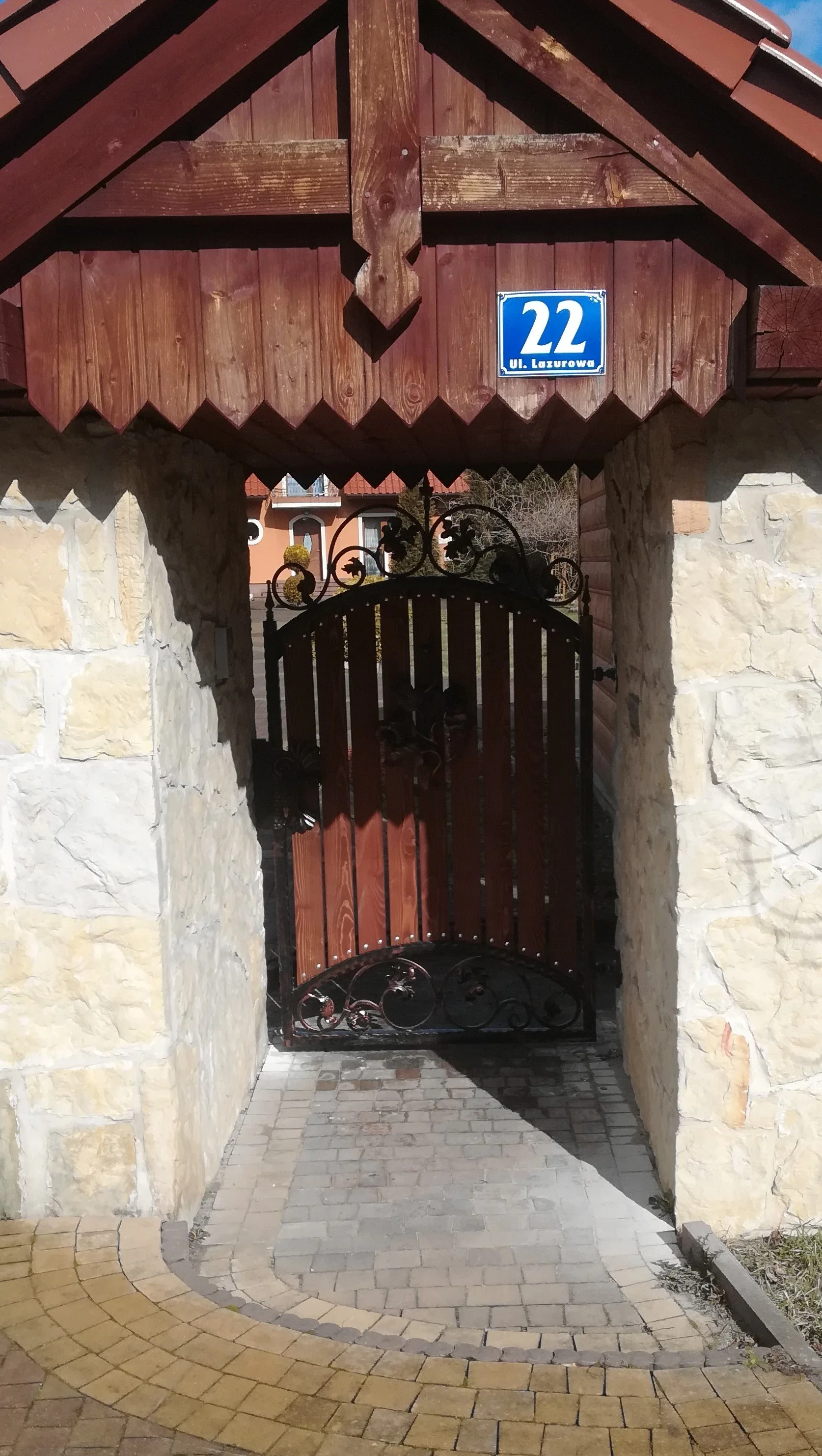 Solidna konstrukcja furtki z pełnym wypełnieniem drewnianym. Estetyczne połączenie śrubowe i kute detale ozdobne.