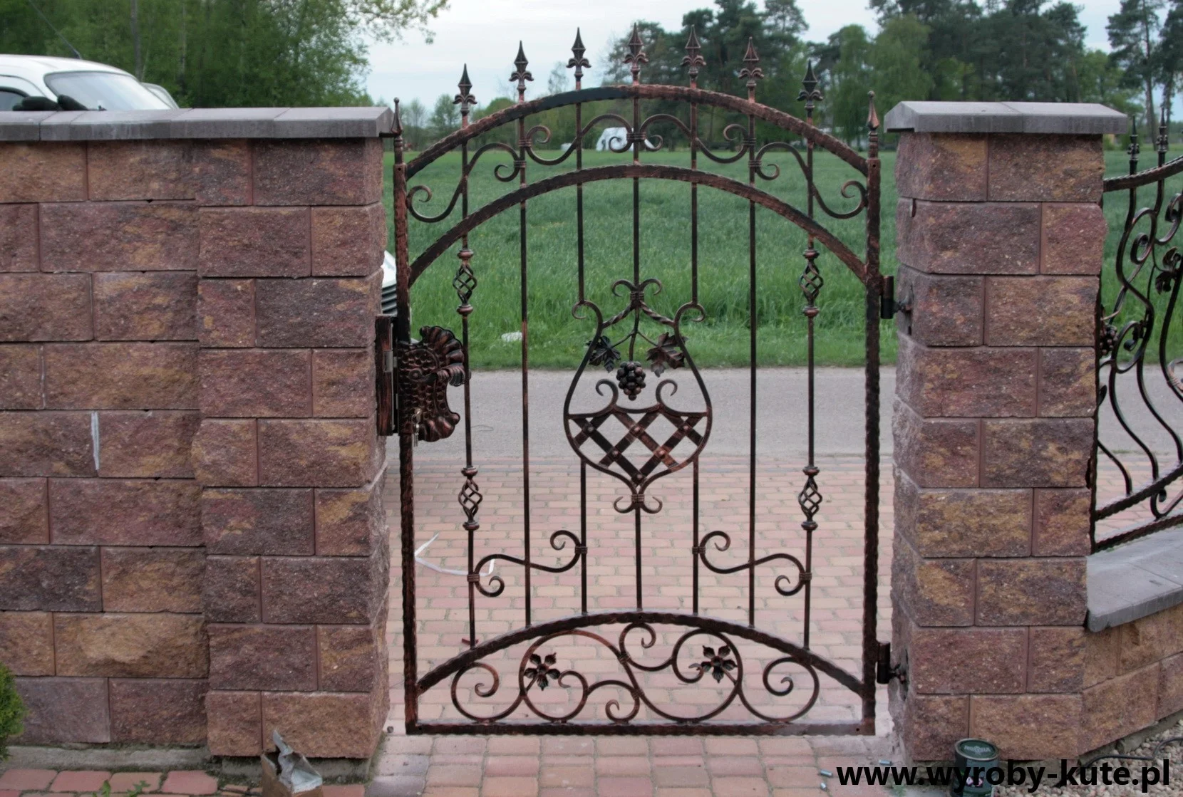 Furtka wejściowa osadzona w masywnych słupkach z bloczków łupanych imitujących kamień. Metaloplastyka w ciepłym, miedziano-rdzawym kolorze doskonale komponuje się z barwą słupków.