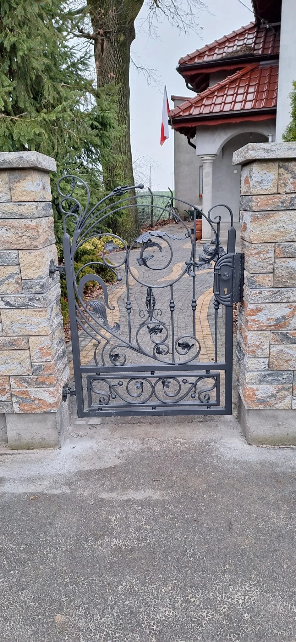Klasyczna furtka kuta zdobiona centralnym medalionem i esownicami. Idealnie komponuje się z łupanym kamieniem na słupach ogrodzeniowych.