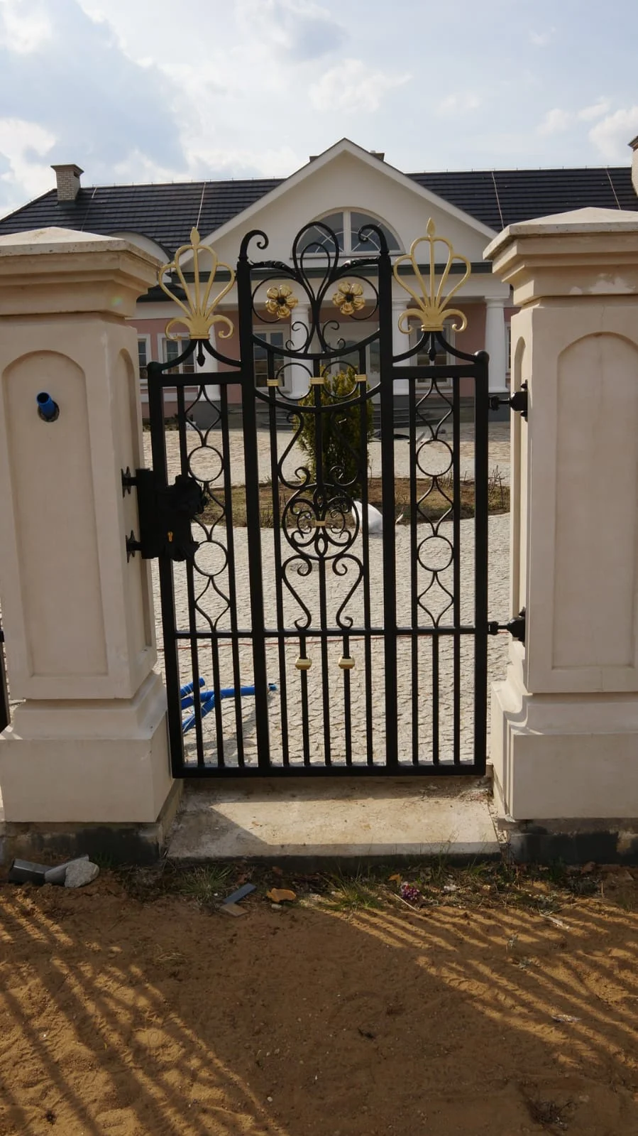 Furtka stanowiąca wizytówkę domu. Uwagę przykuwają złocone detale florystyczne umieszczone w górnej partii (fryzie). Symetryczny układ i solidne wykonanie podkreślają reprezentacyjny charakter wejścia.