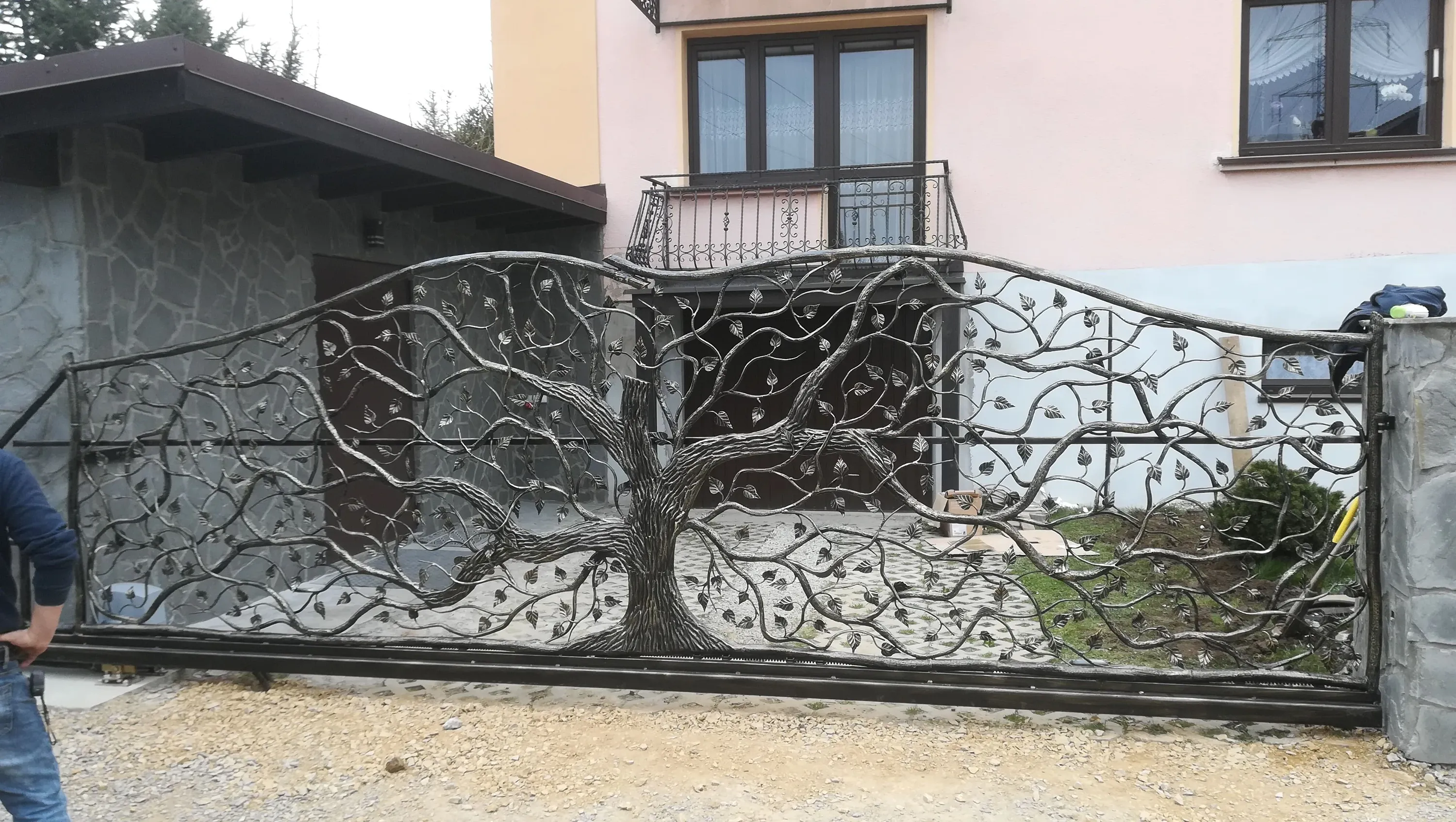 Widok na całą konstrukcję bramy przesuwnej. Ażurowy wzór z liśćmi nadaje optycznej lekkości całej posesji.