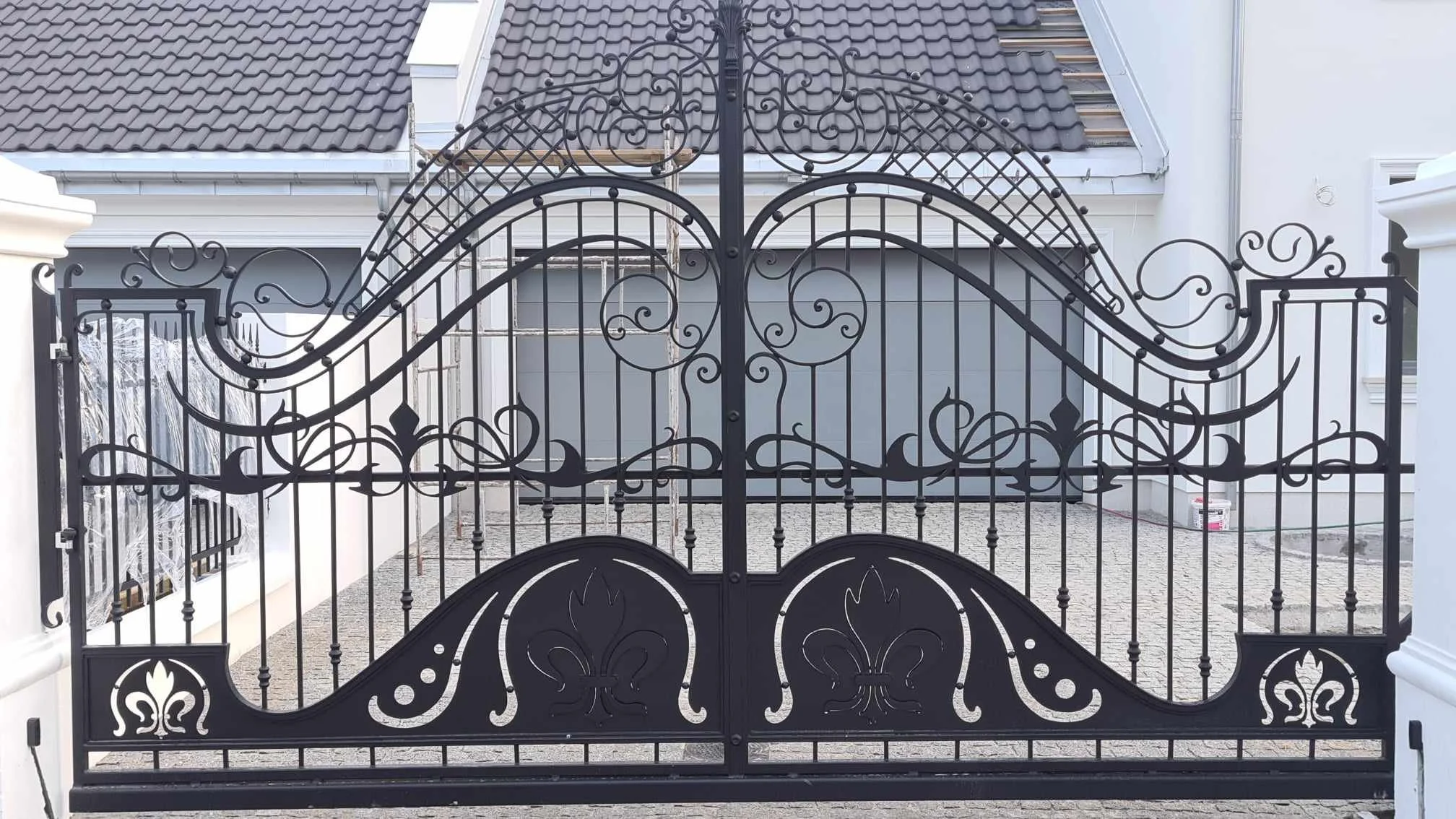 Widok od przodu na potężną bramę kuta. Przykład najwyższej klasy rzemiosła artystycznego wyroby-kute.pl.