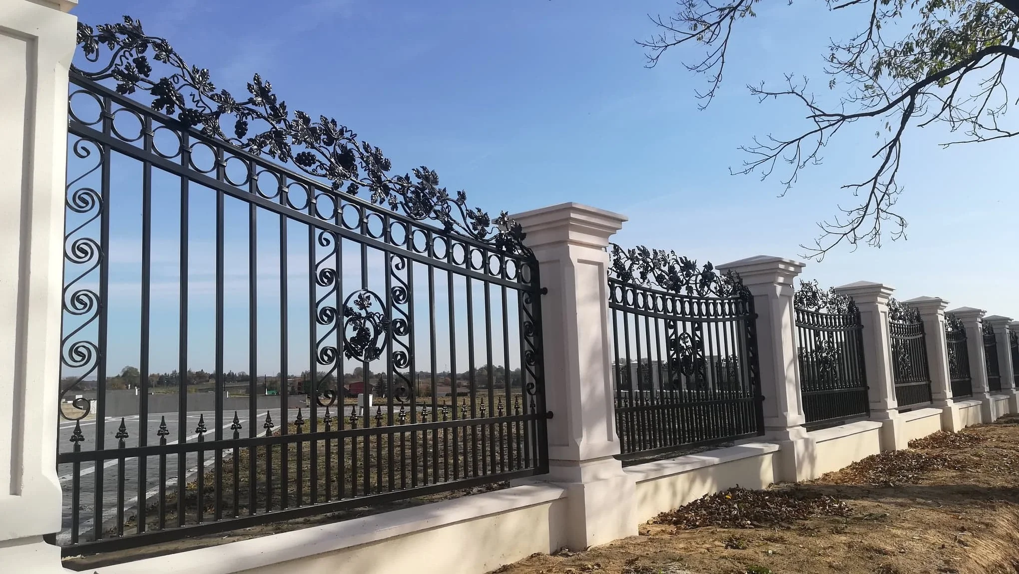 Frontowa część ogrodzenia zlokalizowana przy wjeździe. Brama dwuskrzydłowa i furtki utrzymane w tej samej stylistyce co przęsła - z charakterystycznym pasem winorośli. Całość dopełniają stylowe latarnie zamontowane na słupkach, podkreślające prestiż posesji.