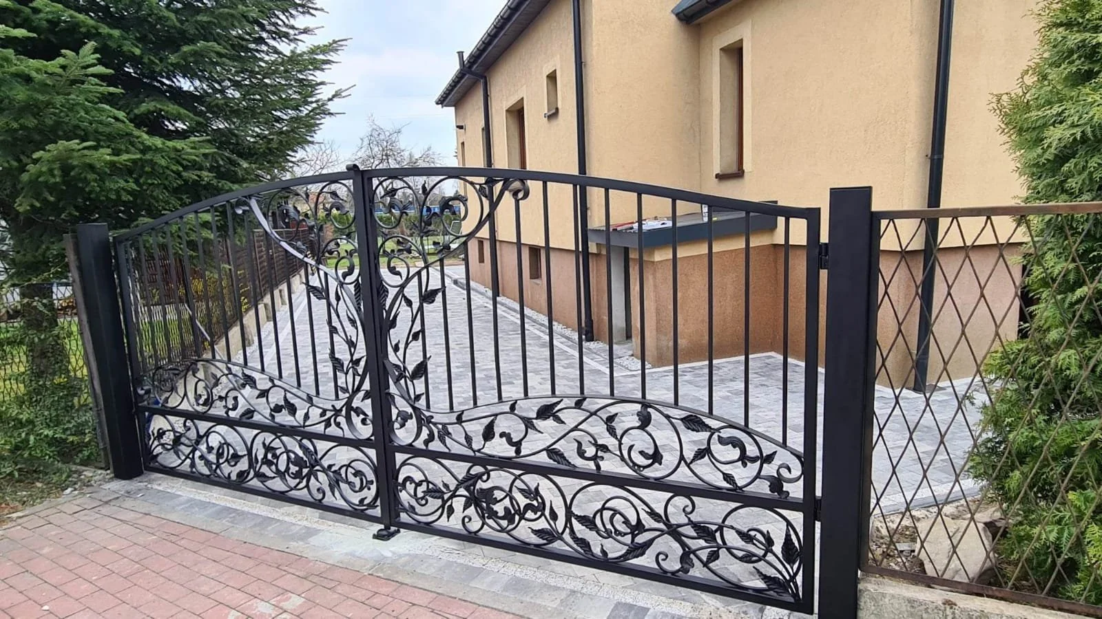 Prezentowana realizacja to kwintesencja luksusu, która redefiniuje pojęcie elegancji u progu ekskluzywnej posiadłości. Brama 'Arystokratyczny Ogród' stanowi harmonijne połączenie rzemieślniczej tradycji z nowoczesnym podejściem do architektonicznego wizjonerstwa. Każdy detal, od misternie wykuwanych liści po płynne linie kunsztownych wolut, został zaprojektowany, aby budzić nieukrywany podziw i podkreślać wysoki status właściciela. Gra świateł i cieni na czarnym, matowym wykończeniu nadaje strukturze fascynującej, trójwymiarowej głębi, sprawiając, że metal zdaje się ożywać w blasku południowego słońca. To nie tylko element zabezpieczający, ale przede wszystkim rzeźbiarskie dzieło sztuki, które nadaje posesji niepowtarzalny charakter i chroni prywatność w sposób niezwykle wyrafinowany. Konstrukcja emanuje spokojem i wewnętrzną siłą, stanowiąc doskonałą wizytówkę domu, która z godnością przetrwa próbę czasu. Każde uderzenie młota w naszej kuźni miało na celu wydobycie z surowej stali duszy, która teraz wita gości swoją majestatyczną formą. Firma IDEOVO specjalizuje się w kompleksowej obsłudze: od indywidualnego projektu, przez precyzyjne wykonanie w naszej manufakturze, aż po profesjonalny montaż, gwarantując najwyższy standard na każdym etapie realizacji.