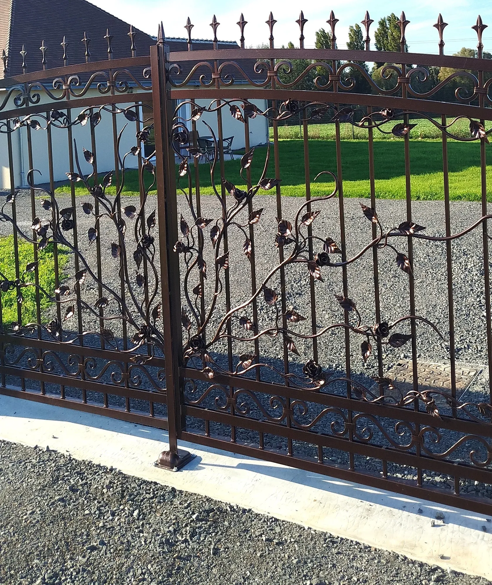 Widok na cały front posesji, gdzie brama i furtka wykonane w tym samym, unikalnym stylu floralnym tworzą niezapomniane wrażenie.
