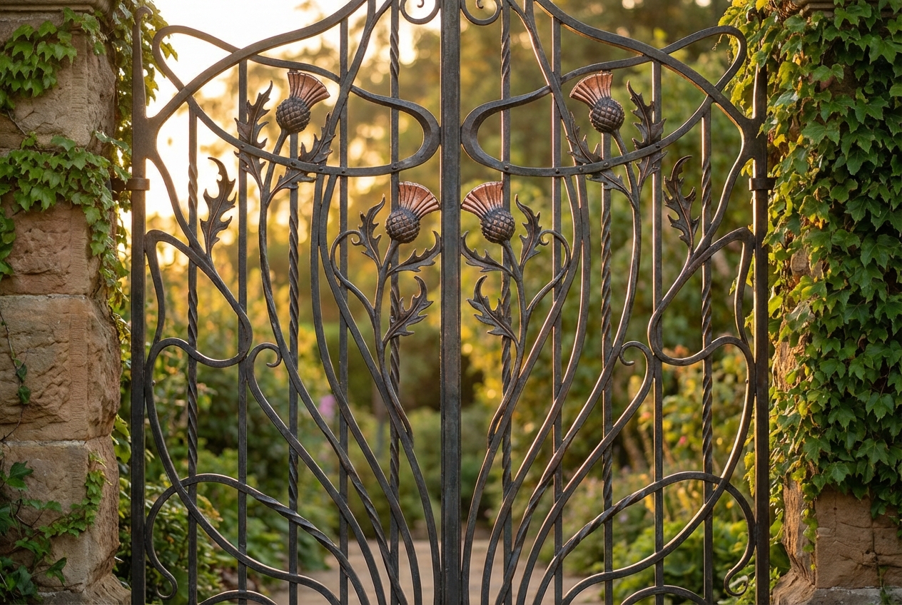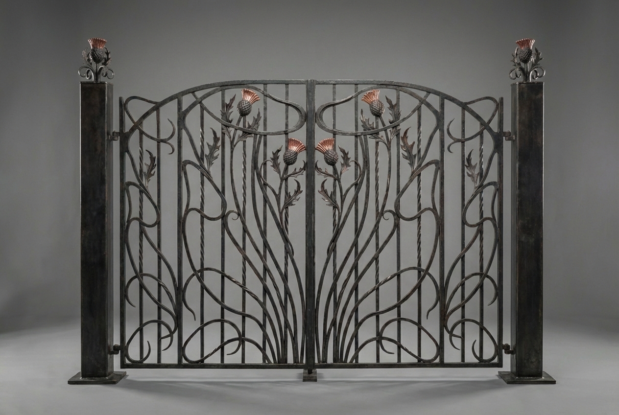 Wrota 'Symfonia Natury' – Luksusowa Brama Kuta w Stylu Secesyjnym z Ostropestem