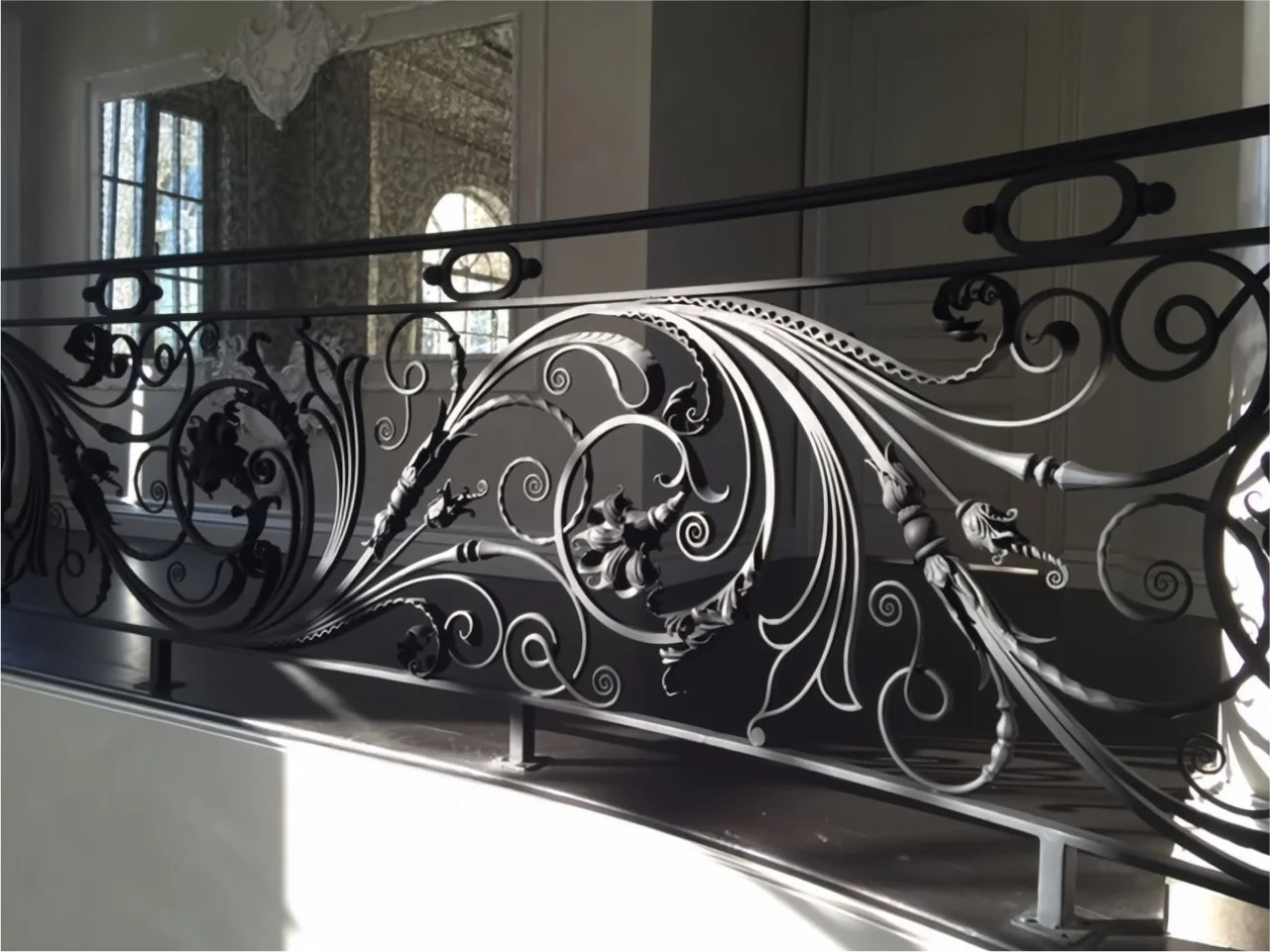 Zbliżenie na centralny ornament balustrady. Zastosowanie różnorodnych technik kowalskich pozwoliło uzyskać niesamowitą trójwymiarowość i szczegółowość motywów roślinnych.