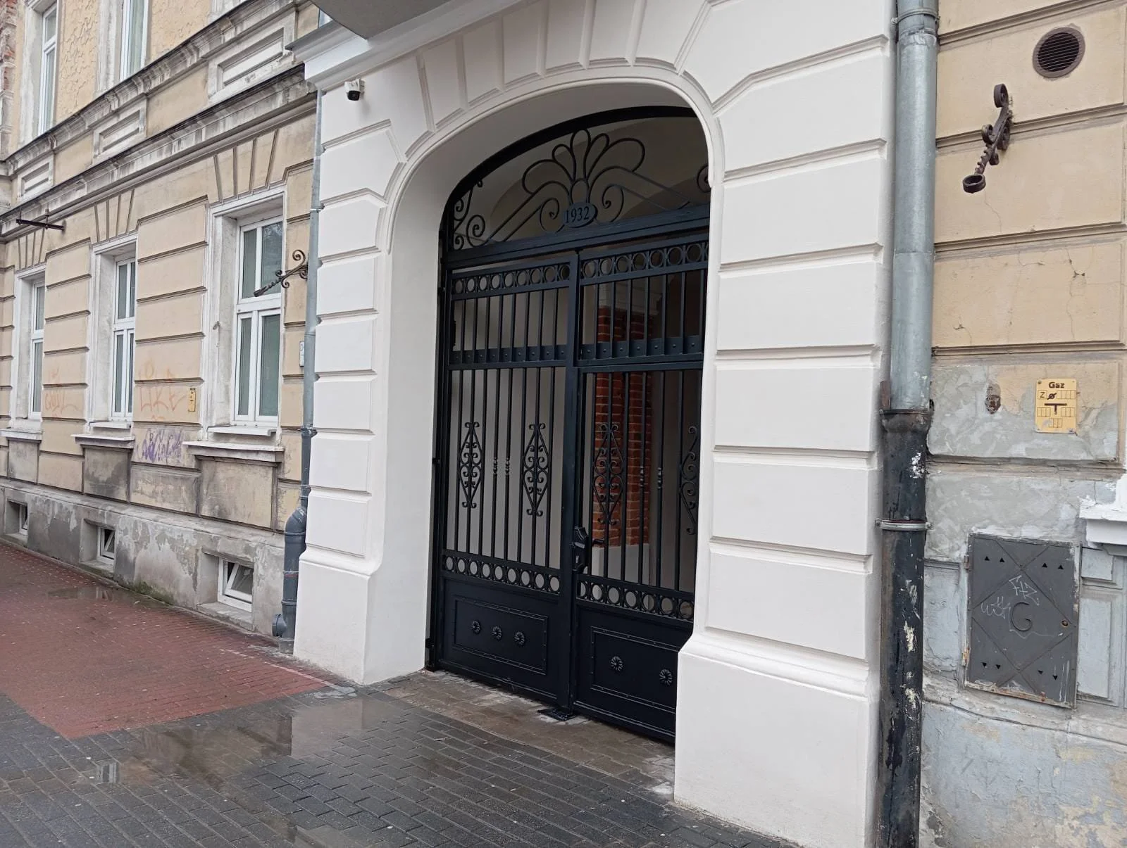To ujęcie podkreśla kunszt odwzorowania historycznych detali – od kroju cyfr po symetrię liściastych wzorów w zwieńczeniu bramy.