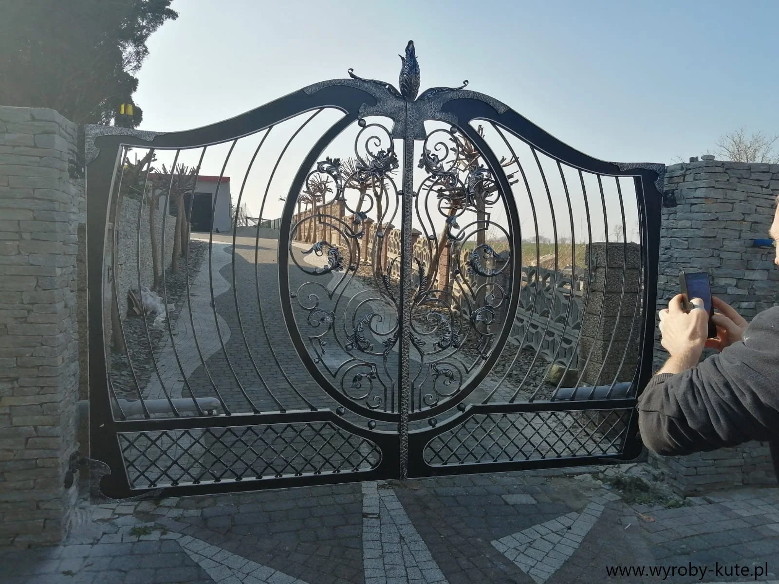 Fotografia podkreślająca detale wykończenia. Srebrna patyna wydobywa trójwymiarowość kutych liści i esownic, które inaczej zginęłyby na tle czarnej blachy. Dolna część bramy posiada ozdobną kratownicę.