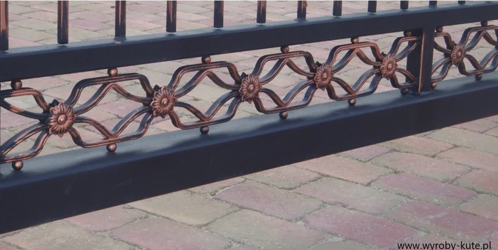 Fotografia ukazująca kunszt wykończenia detali. Dolny pas bramy zdobią geometryczne elementy z centralnymi kwiatami/rozetami, które zostały wyróżnione patyną w kolorze antycznej miedzi.