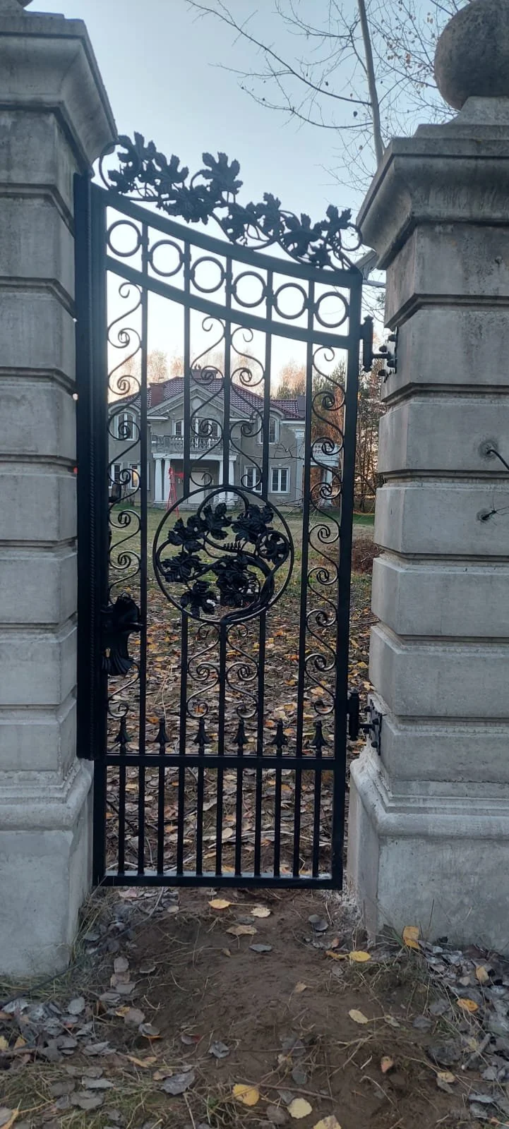 Zbliżenie na misterne zdobienia furtki. Motywy roślinne kute ręcznie z najwyższą precyzją.