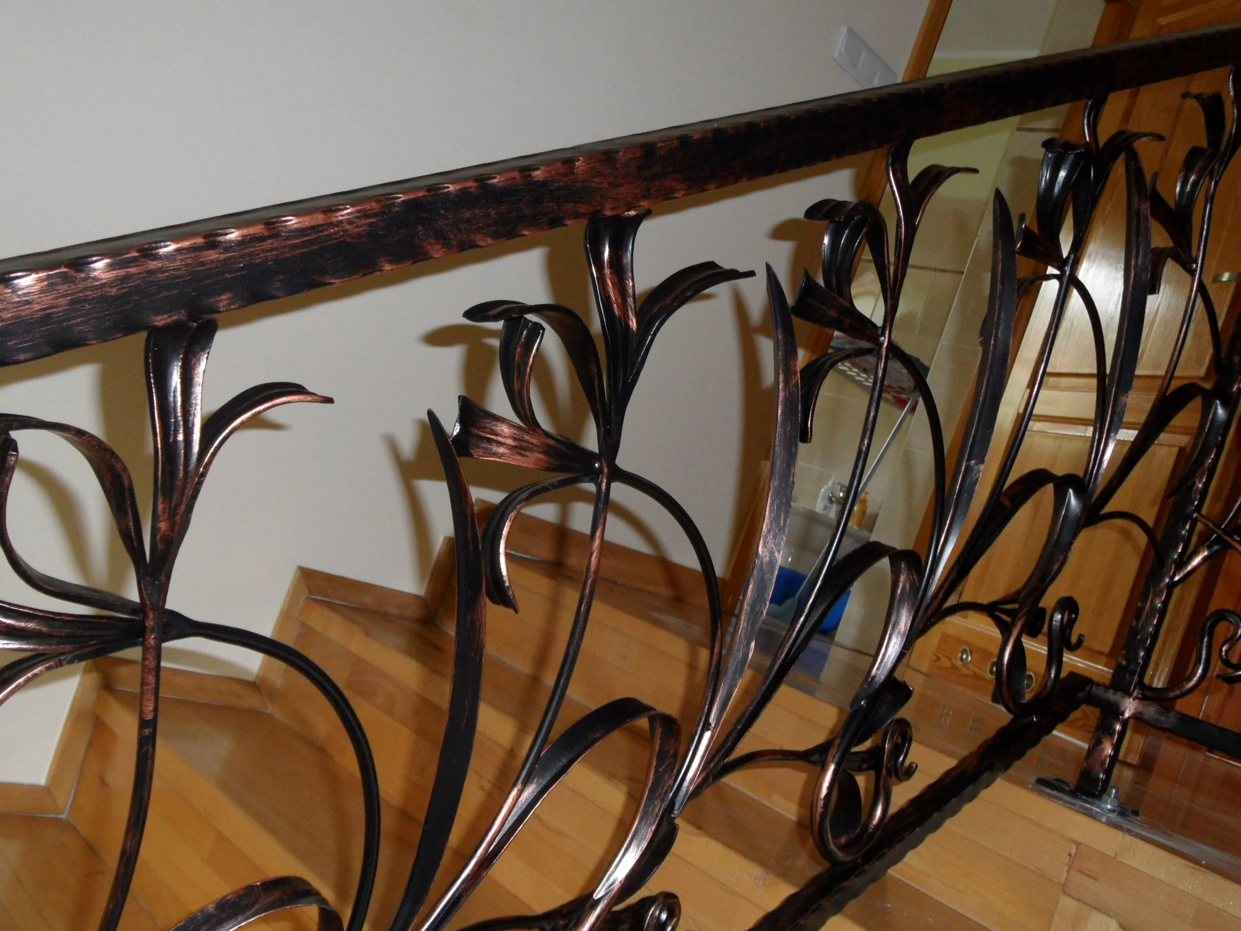 Zbliżenie na precyzyjnie uformowane kute kwiaty. Każdy płatek jest ręcznie modelowany i patynowany, co nadaje balustradzie artystyczny sznyt.