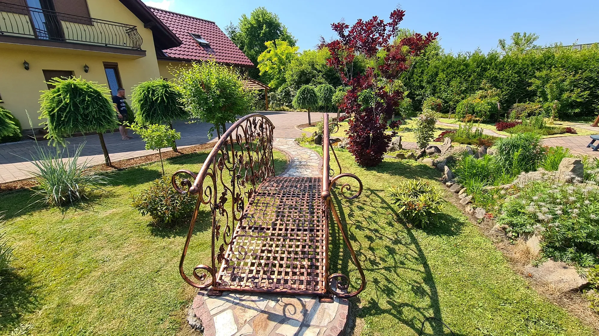 Zbliżenie na misterne zdobienia kowalskie mostka ogrodowego. Ręczne wykonanie każdego liścia nadaje wyrobowi unikalny, rzeźbiarski charakter.