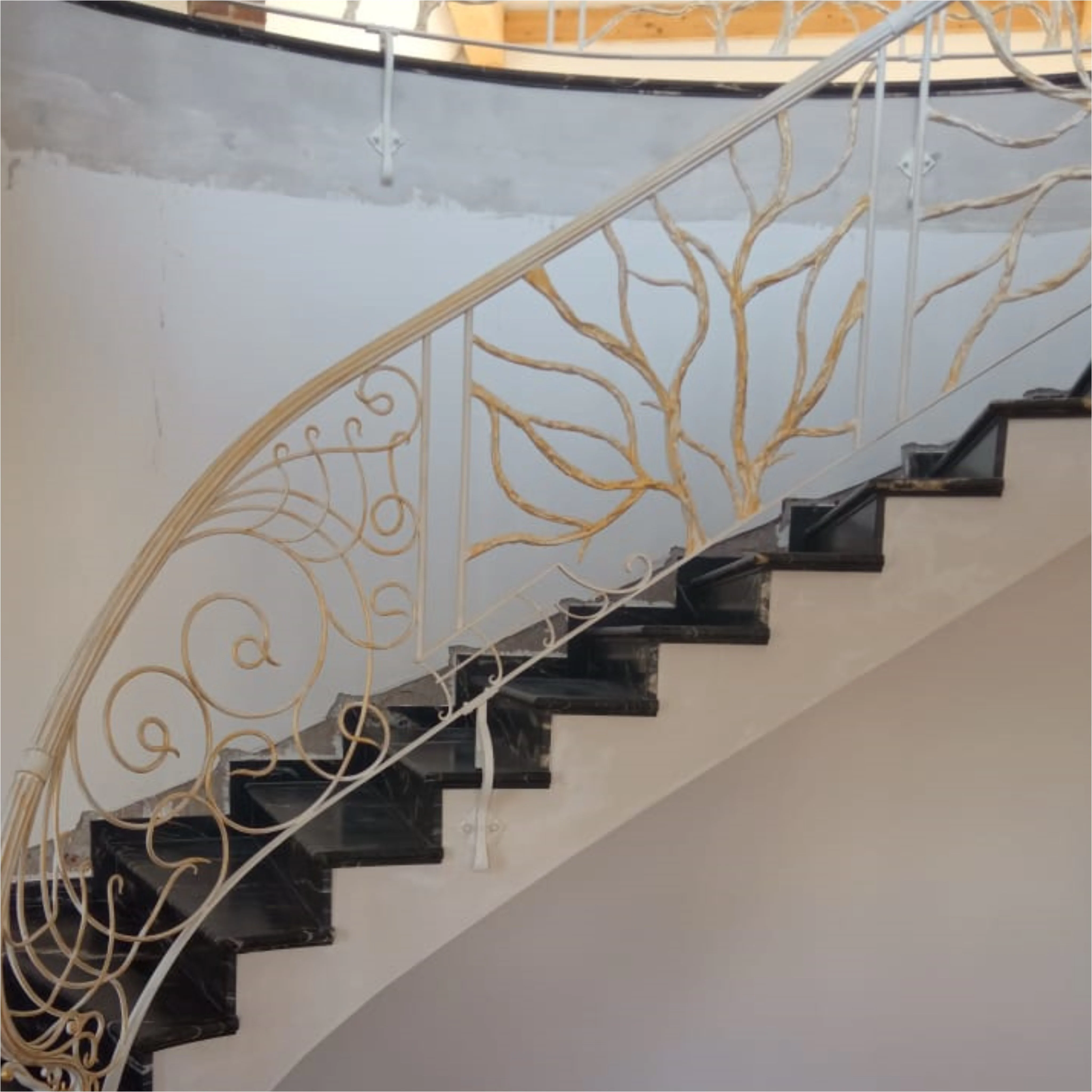 Zbliżenie na fakturę i kolorystykę balustrady. Złote przecierki na jasnym tle eksponują ręczne kucie i nadają metalowi miękkości.