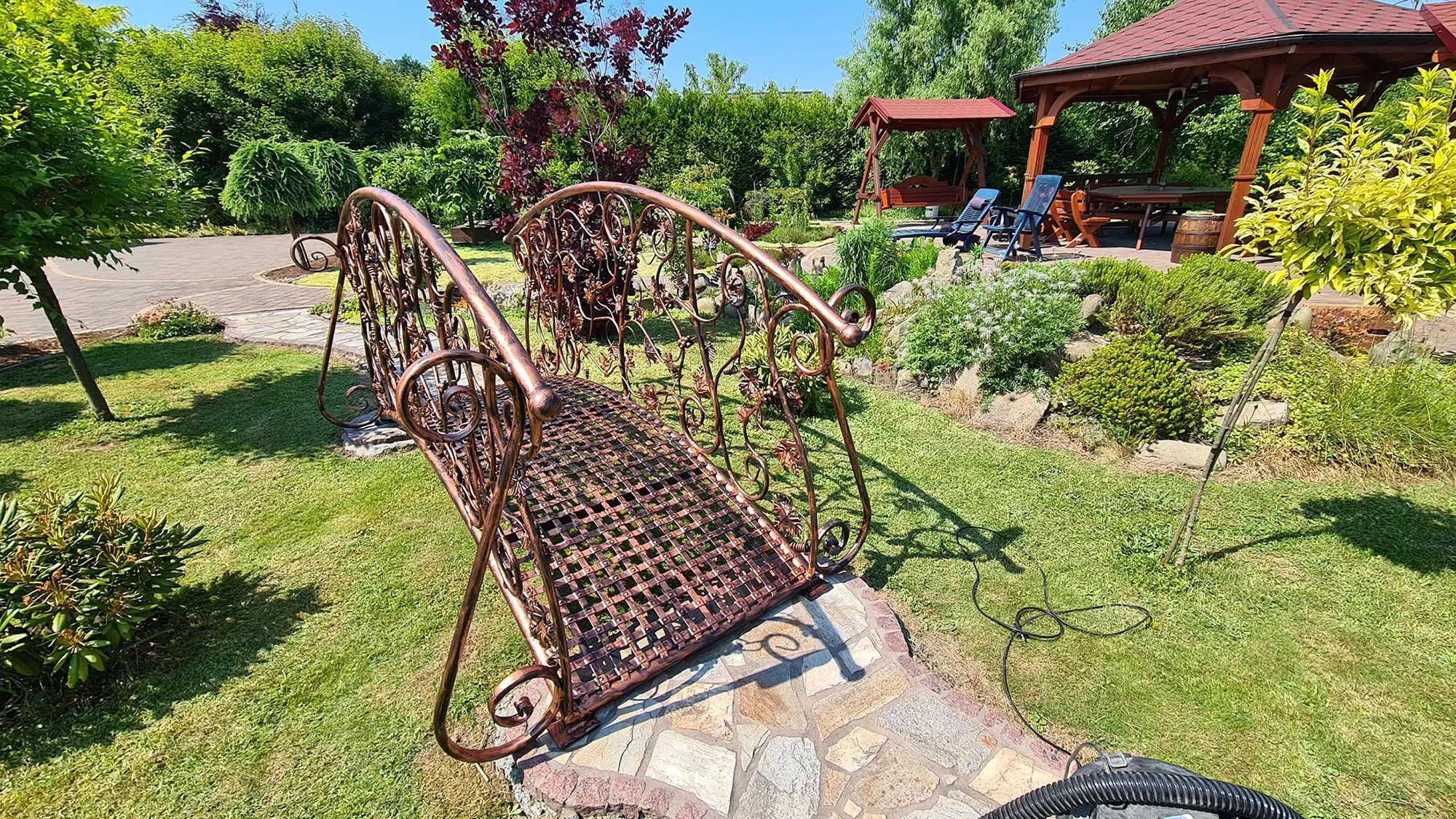 Perspektywa boczna ozdobnego mostka ogrodowego. Stabilna konstrukcja stalowa z bogatymi zdobieniami, idealna do aranżacji zieleni.