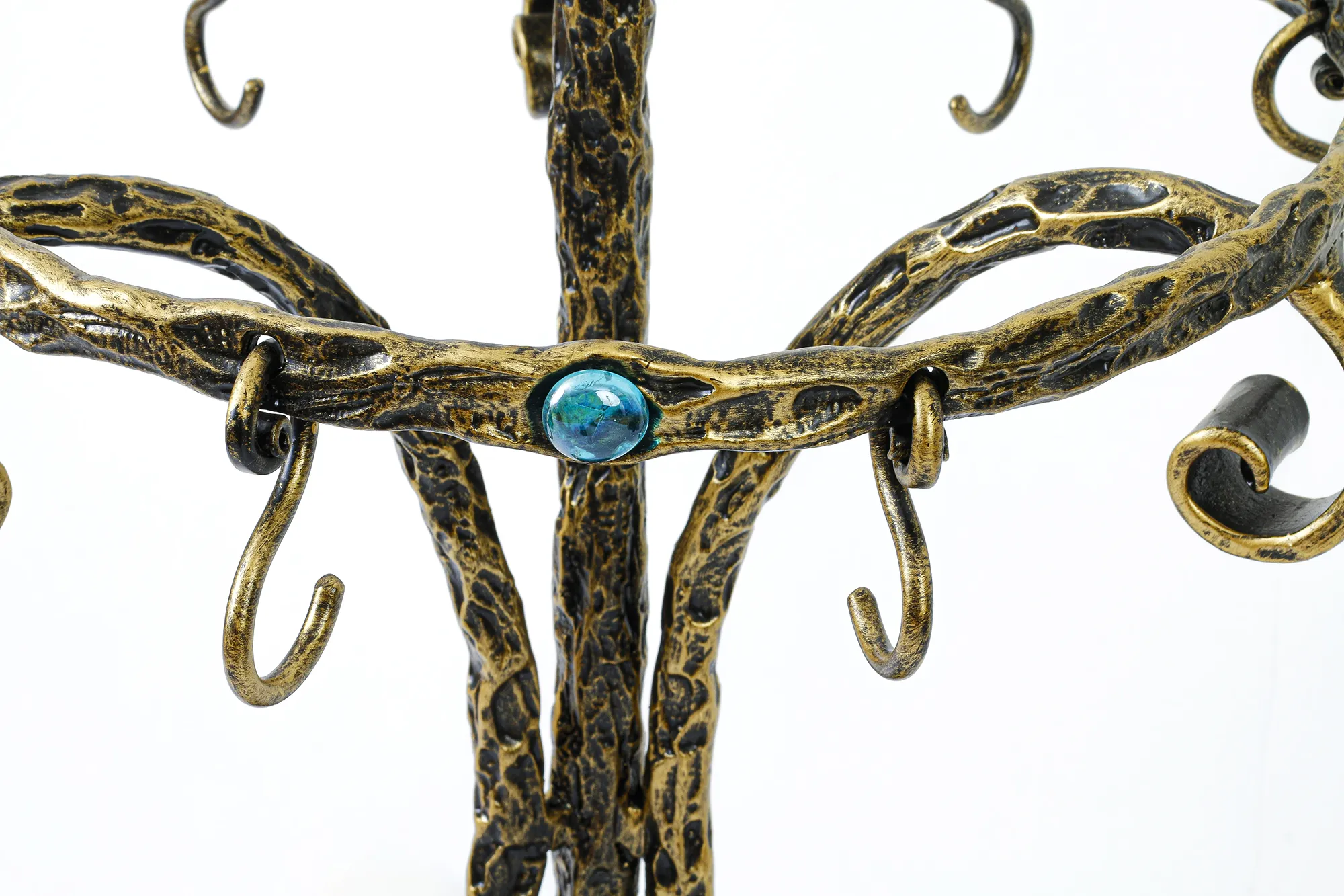 Wzbogacenie formy kowalskiej o element szklany (oczko turkusowe) dodaje lekkości i koloru. Precyzyjne zakuwanie elementu ozdobnego świadczy o wysokim kunszcie wykonania.
