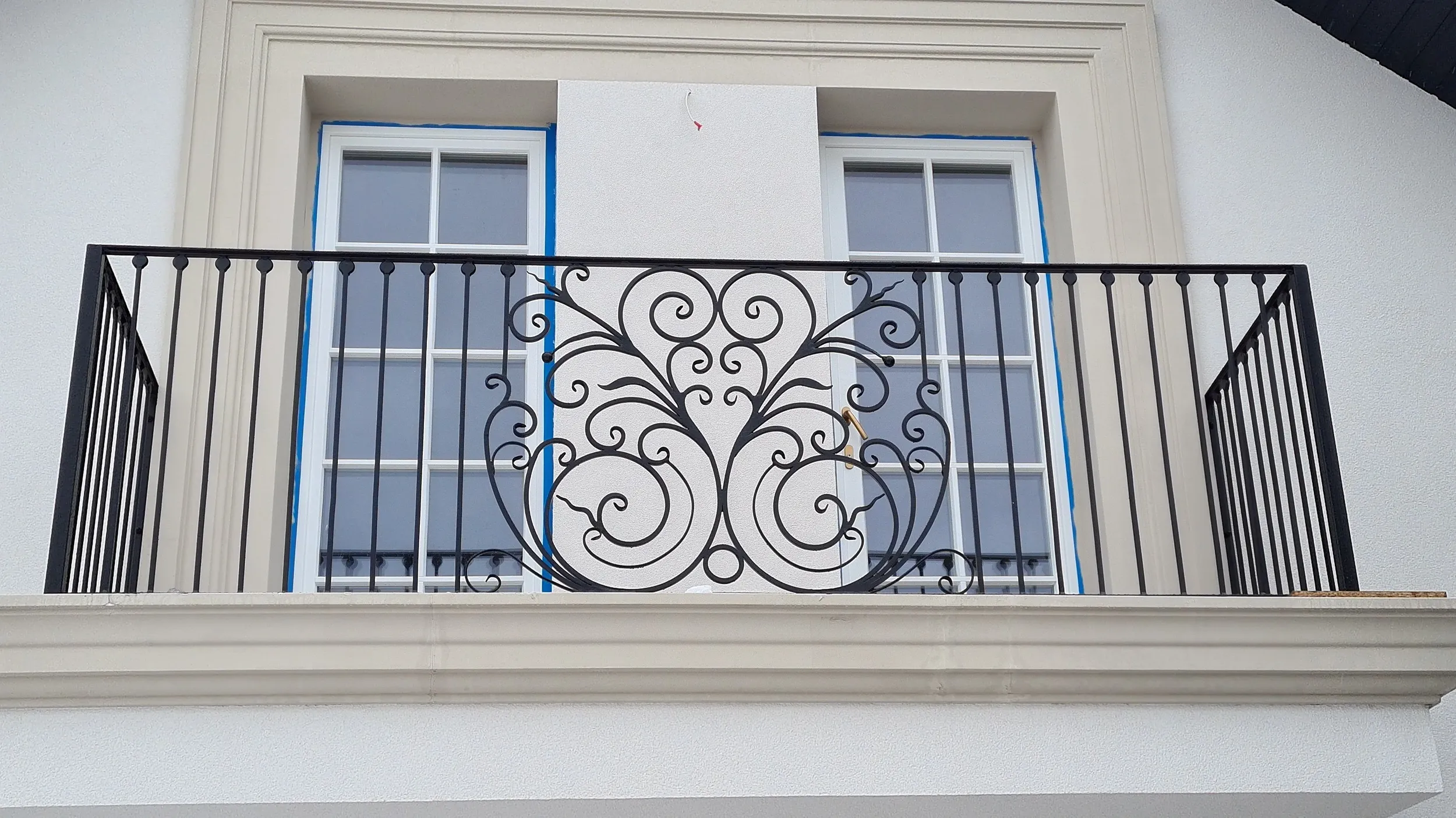 Zbliżenie na misternie wykonany centralny detal balustrady. Klasyczna metaloplastyka w najlepszym wydaniu.