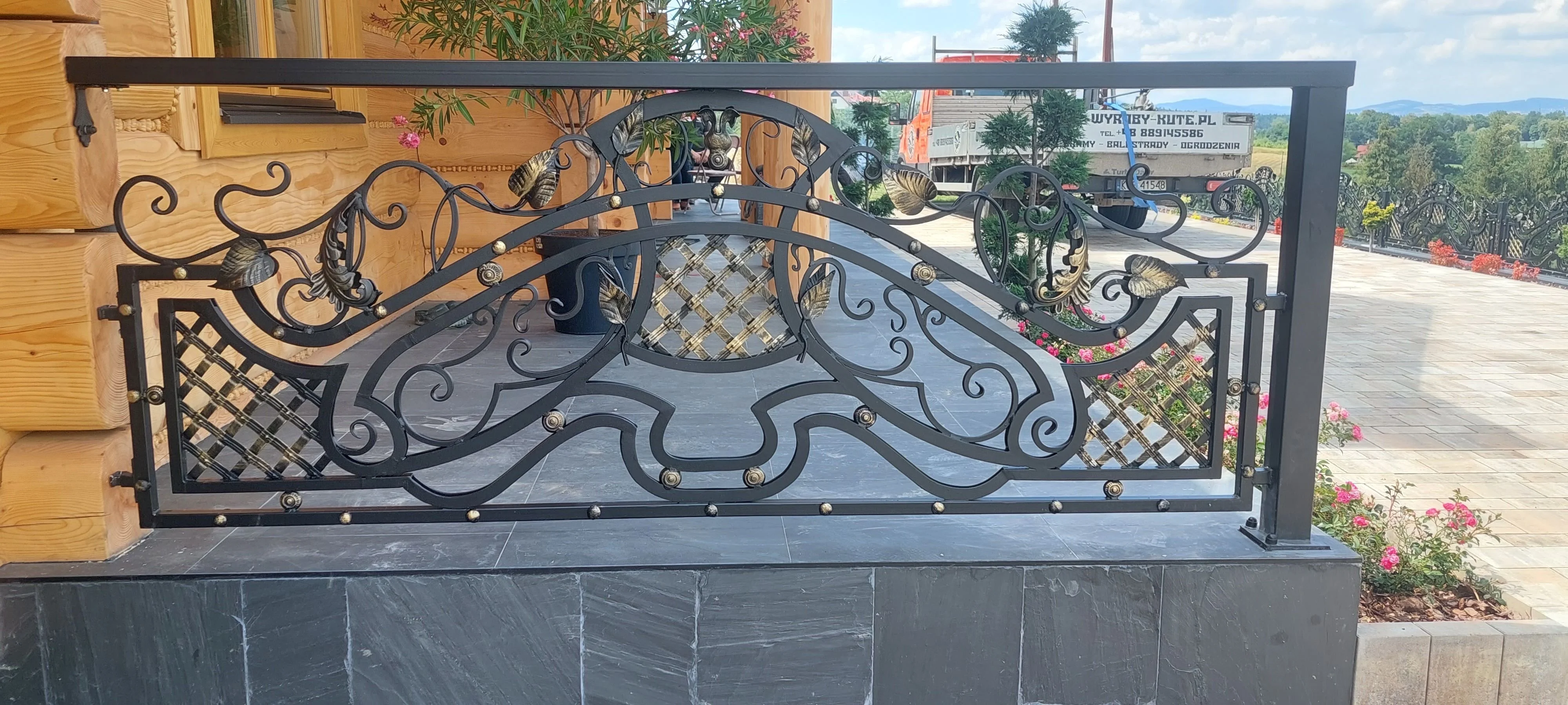 Widok od przodu na pojedynczy moduł balustrady. Widać tu harmonijne połączenie różnych technik kowalskich i dbałość o proporcje.