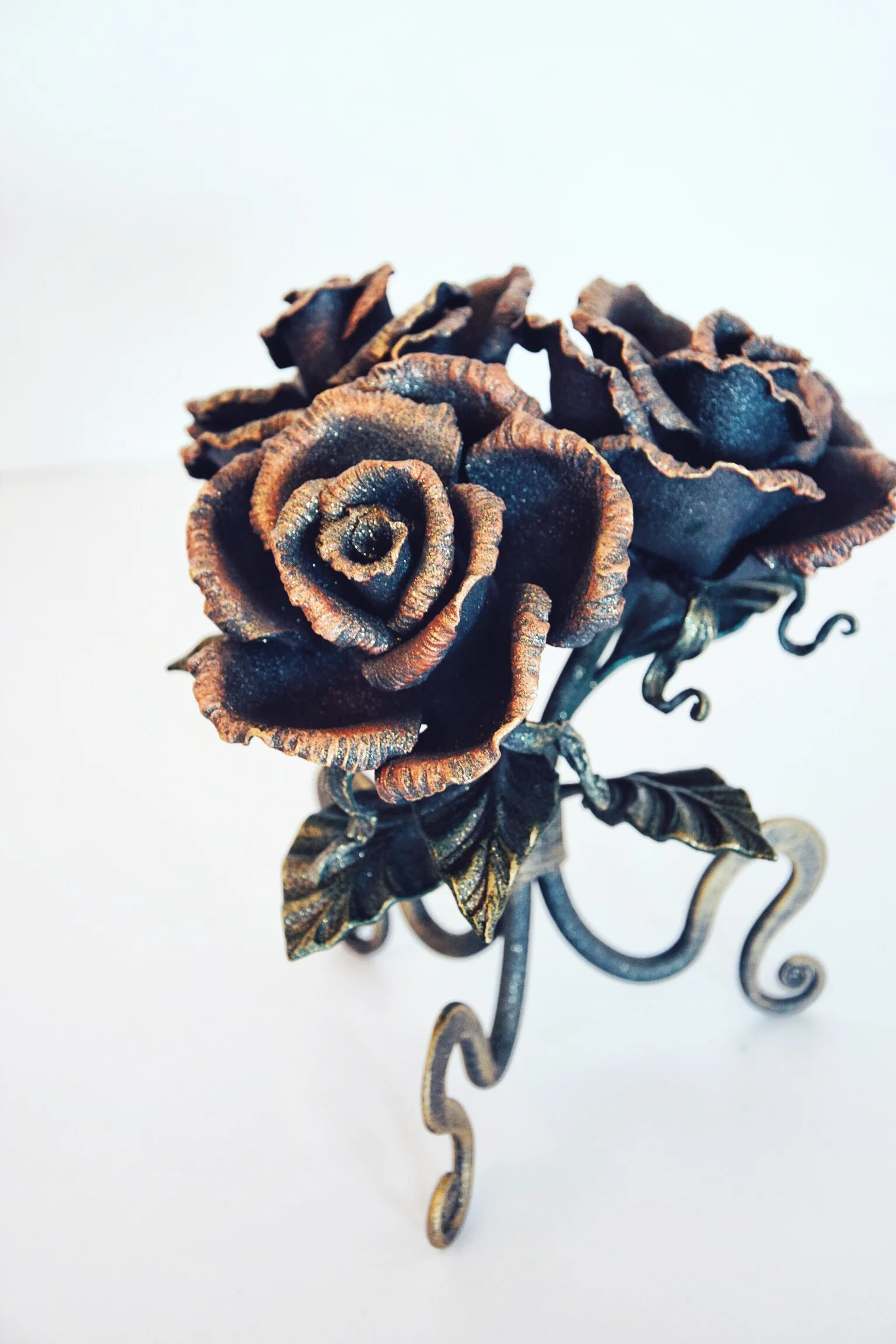 Na zbliżeniu widać dbałość o detale - środek róży jest gęsto i precyzyjnie uformowany, imitując naturalne ułożenie płatków. Faktura "skórki pomarańczy" na metalu dodaje autentyczności.