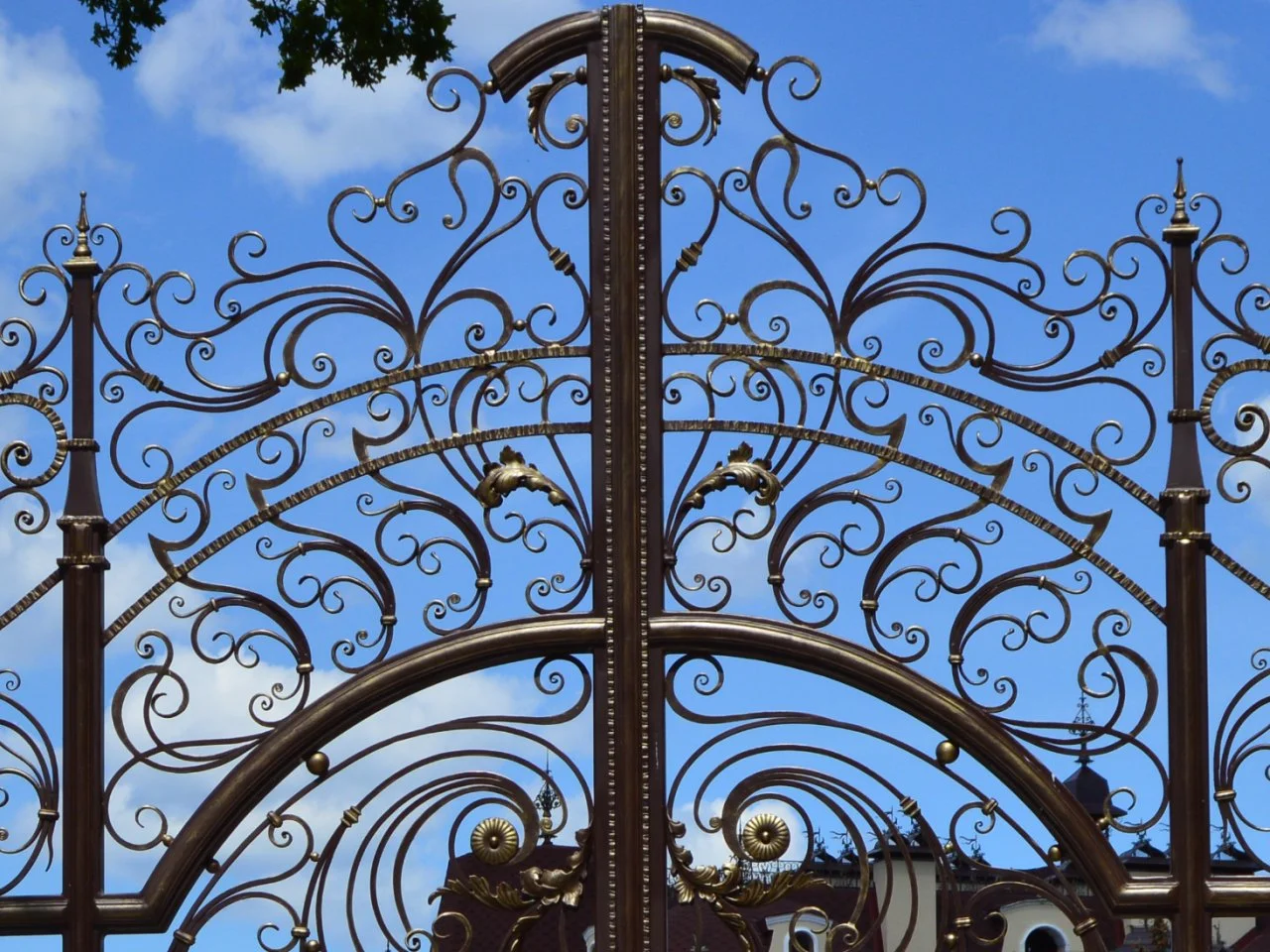 Zbliżenie na górną partię naszej najbardziej zdobionej bramy. Symetryczne układ mniejszych i większych wolut, zwieńczonych ozdobnymi grotami, tworzy lekką, ażurową koronę, która pięknie prezentuje się na tle nieba.
