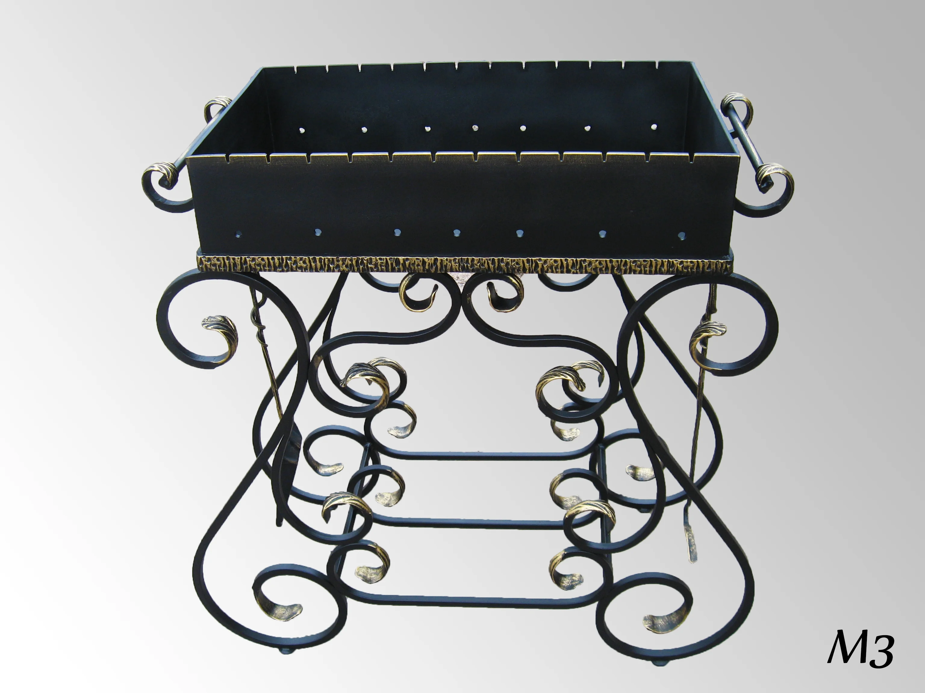 Mebel kominkowy o wysokich walorach estetycznych. Dolna część to misterna plątanina kutych prętów zakończonych złotymi liśćmi akantu, na której spoczywa solidna misa na drewno.