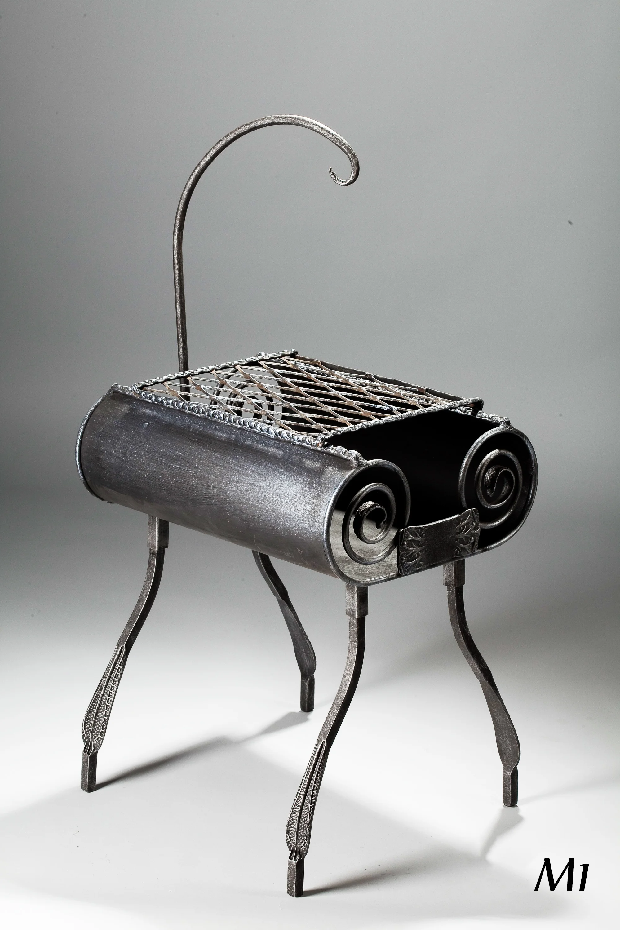 Solidny i pojemny kosz o nowoczesnej, nieco industrialnej linii. Boki zakończone ozdobnymi spiralami (wolutami). Góra wykończona kratownicą, która może służyć jako półka na podpałkę.