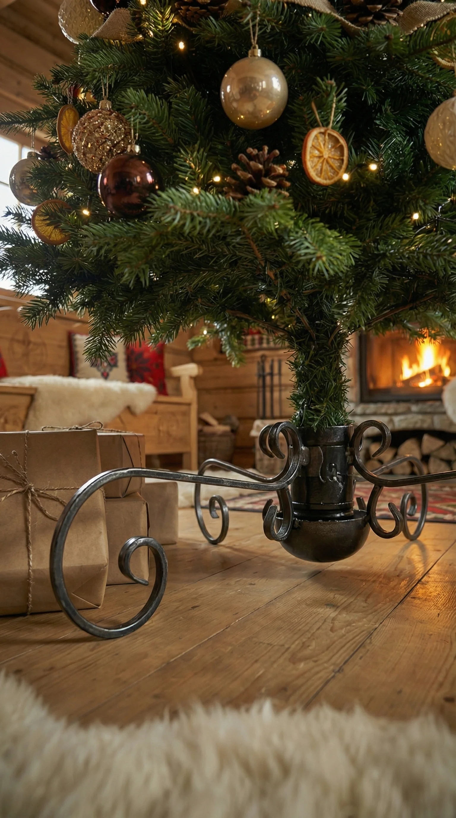 Solidny, ręcznie kuty stojak pod choinkę. Zapewnia maksymalną stabilność nawet dużym drzewkom, będąc jednocześnie piękną dekoracją świąteczną.