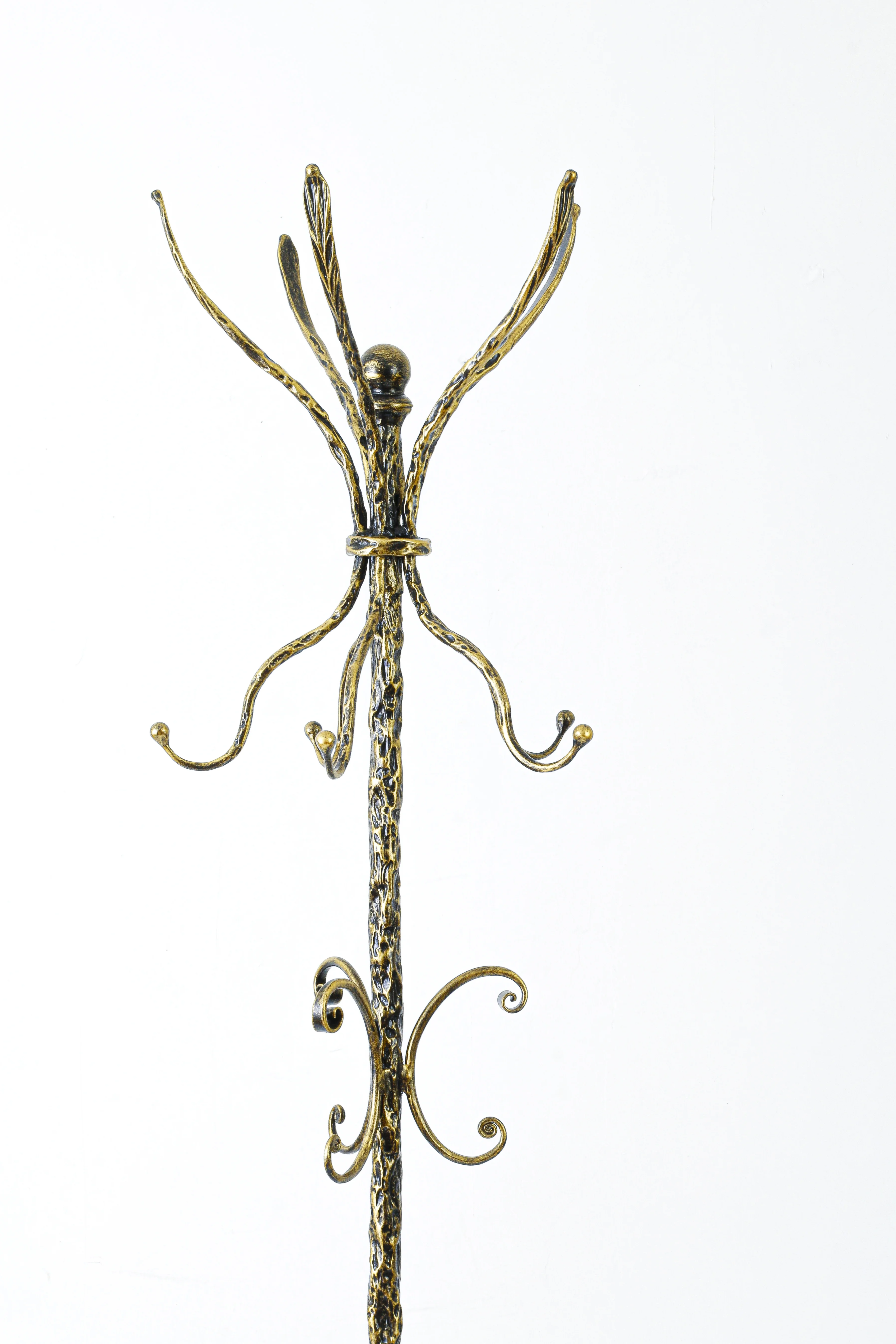 Stylowy i funkcjonalny wieszak wolnostojący, wykonany z dbałością o każdy detal. Powierzchnia młotkowana (faktura "kora drzewa") nadaje mu unikalny charakter, a złota patyna podkreśla artystyczne walory kowalstwa.