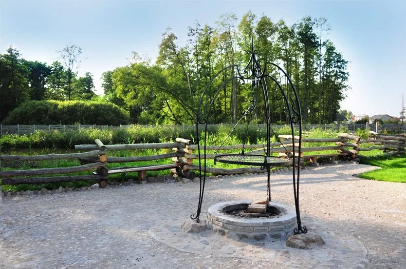 Imponujący zestaw ogrodowy składający się z kamiennego kręgu paleniska oraz kutego trójnogu z wiszącym rusztem. Konstrukcja stalowa zdobiona jest elementami kutymi (esownice, groty). Ruszt zawieszony na łańcuchach z możliwością regulacji wysokości.