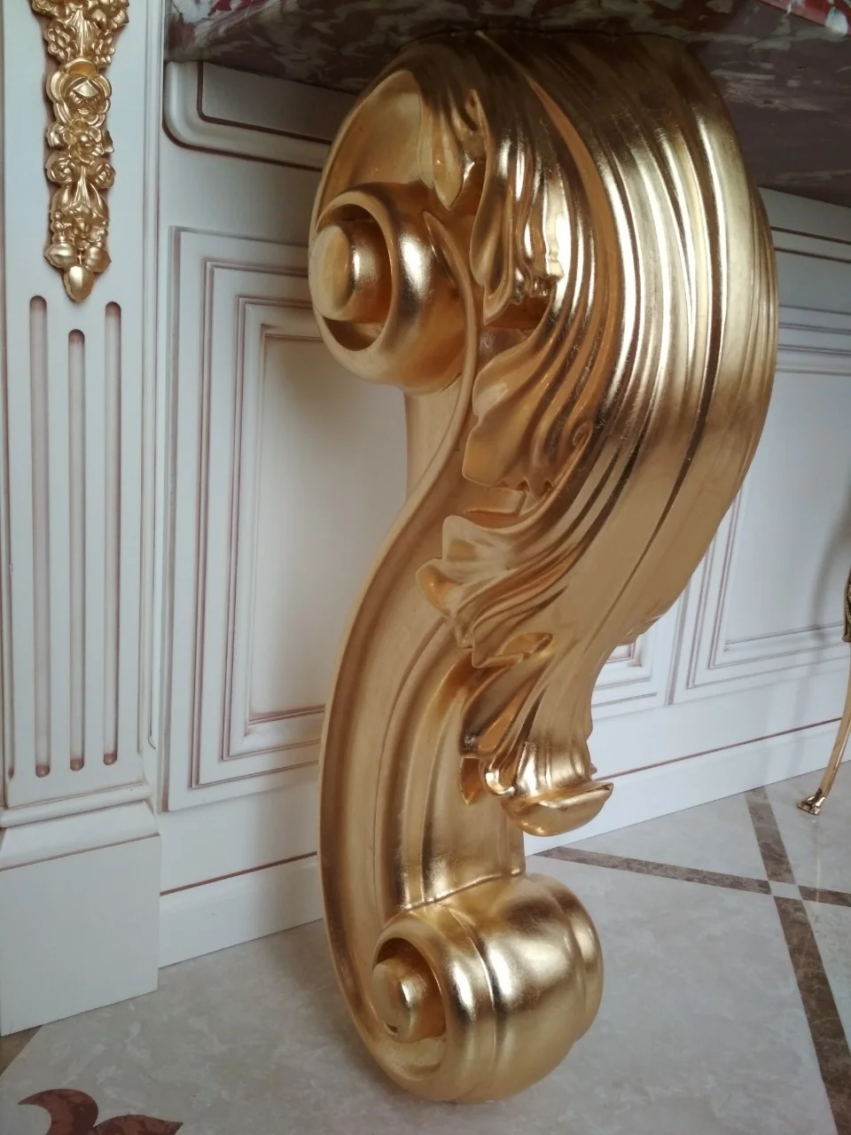 Element konstrukcyjny i dekoracyjny luksusowego mebla. Noga w kształcie litery S (kabriolowa), bogato rzeźbiona w motywy roślinne i pokryta złotem. Przykład najwyższej klasy stolarstwa artystycznego.