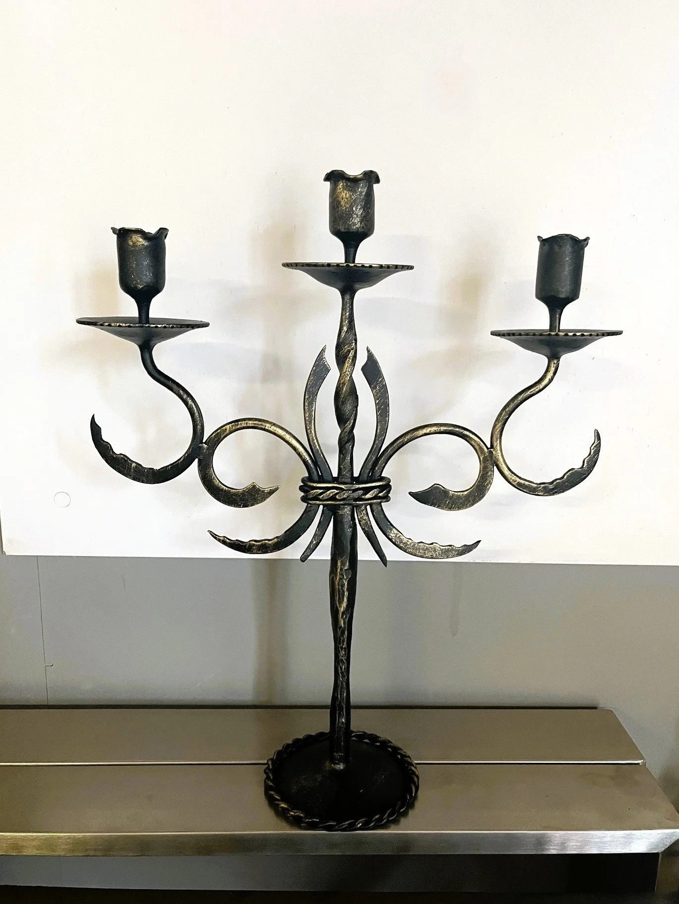 Świecznik kuty, który dzięki technice patynowania nabiera głębi i antycznego wyglądu.